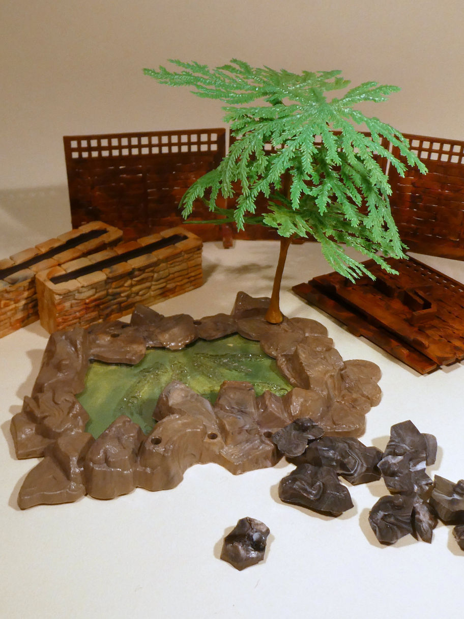 Fence panels with supports, pond and rocks. Tree and three blocks of planters.