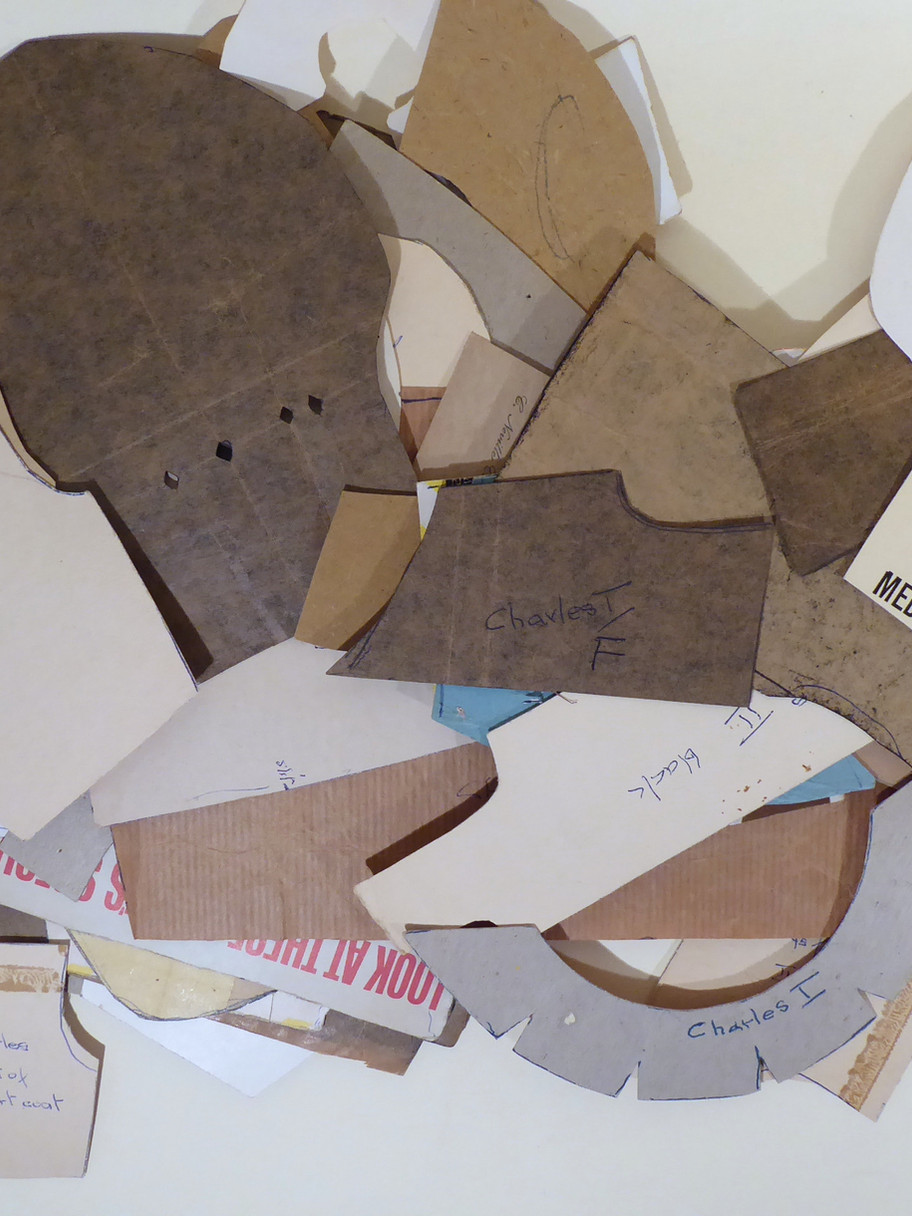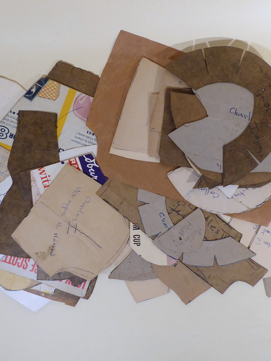 Bob Pelham's wife Anne, designed the costumes for the Historical Characters. This is a collection of cut out templates for the costumes of the Historical Characters made by Pelham Puppets. The patterns are cut from pieces of card and brown paper and other items. The provenance I have that they could be original factory templates for the home workers or factory workers, is that they have come from the one of the former employees family who found them in among his Pelham Puppet memorabilia and labelled as such. Many of the pieces of paper and card have Marlborough and surrounding area addresses etc on them, so fit well with the history of where these cutouts originated, near or at, the factory. Some of the cards and papers that they are cut from are from 1950's but not all of them which makes it more complicated to work out the exact provenance. Please see images, especially if you are interested in the costumes of the Historical Characters. This lot has approx 95 pieces of cutouts. Henry and Charles period costumes.