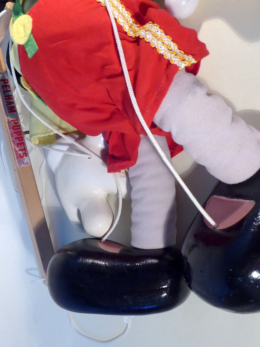 Display range puppet Pinocchio. He measures approx 24" and was designed for shop displays originally. He has heavy large composition Disney hands with rubber tubing legs. He has very good face paint with no damage, still clean and bright. Clothes are also very good, the only defect is the bow tie has come detached, an easy fix. It has two small nails which need to be re inserted to the puppet, or it could just be glued to the shirt. The red feather is also missing and the yellow felt reddened where it had been. The rubber tubing covered legs are very good, also the shoes. The extra large control has the metal strip attached but does not have the ball mechanism to the cord at the front. He has had two small holes drilled into his ears at some stage. He had been strung with wire to each ear which has been removed. I think he needs restringing to get the parts to all beat the correct height. He has a few issues of condition which consist of some repair to the strings and to re fix the bow tie and add a red feather to his hat. Excuse images, the size of the puppet is tricky to hold and photograph! Post will be by myhermes due to the weight and size of the puppet. (UK only please)