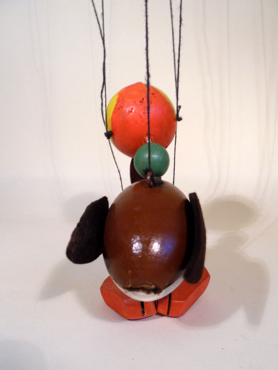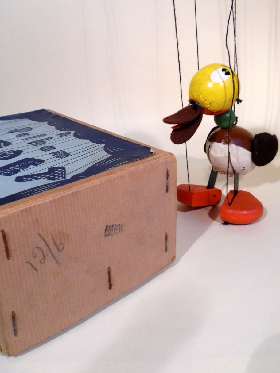 Duck made from wooden parts and metal leg strips. He is a great little puppet only measuring approx 6" tall. A rare character not often seen. The duck is in good condition.Felt parts are good with minimal moth damage. Wings are thick felt with very small moth nibbles and the beak has a moth nibble to the brown part as seen. The paintwork is in very good condition. Box stamped Duck is very good.