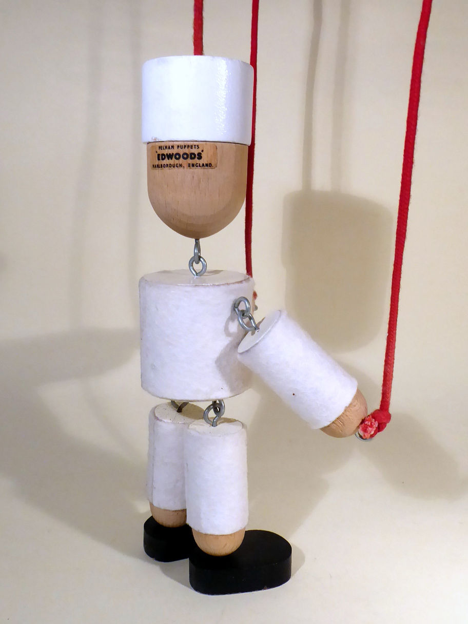 Edwoods were a set of characters made for young children in the latter part of the history of the factory. Made from wood with felt decoration. This is the Doctor, others in the range were Nurse, Policeman, Business Man and Guardsman. These late 80's puppets are rarely seen. Puppet is in good condition with some ageing/dustiness to the white felt clothes. The box is very tatty and faded with tape holding it together. He is easy to manipulate and would make a great gift for a young child keen on puppetry.