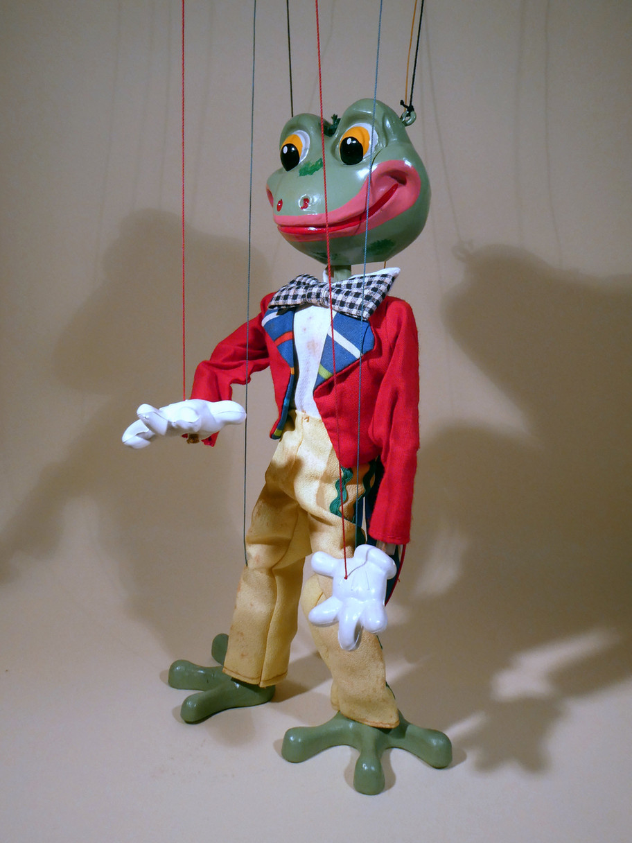 Type SL Frog, he has no cracks or faults other than the clothes are discoloured with foxing age marks on the white shirt and yellow trousers.