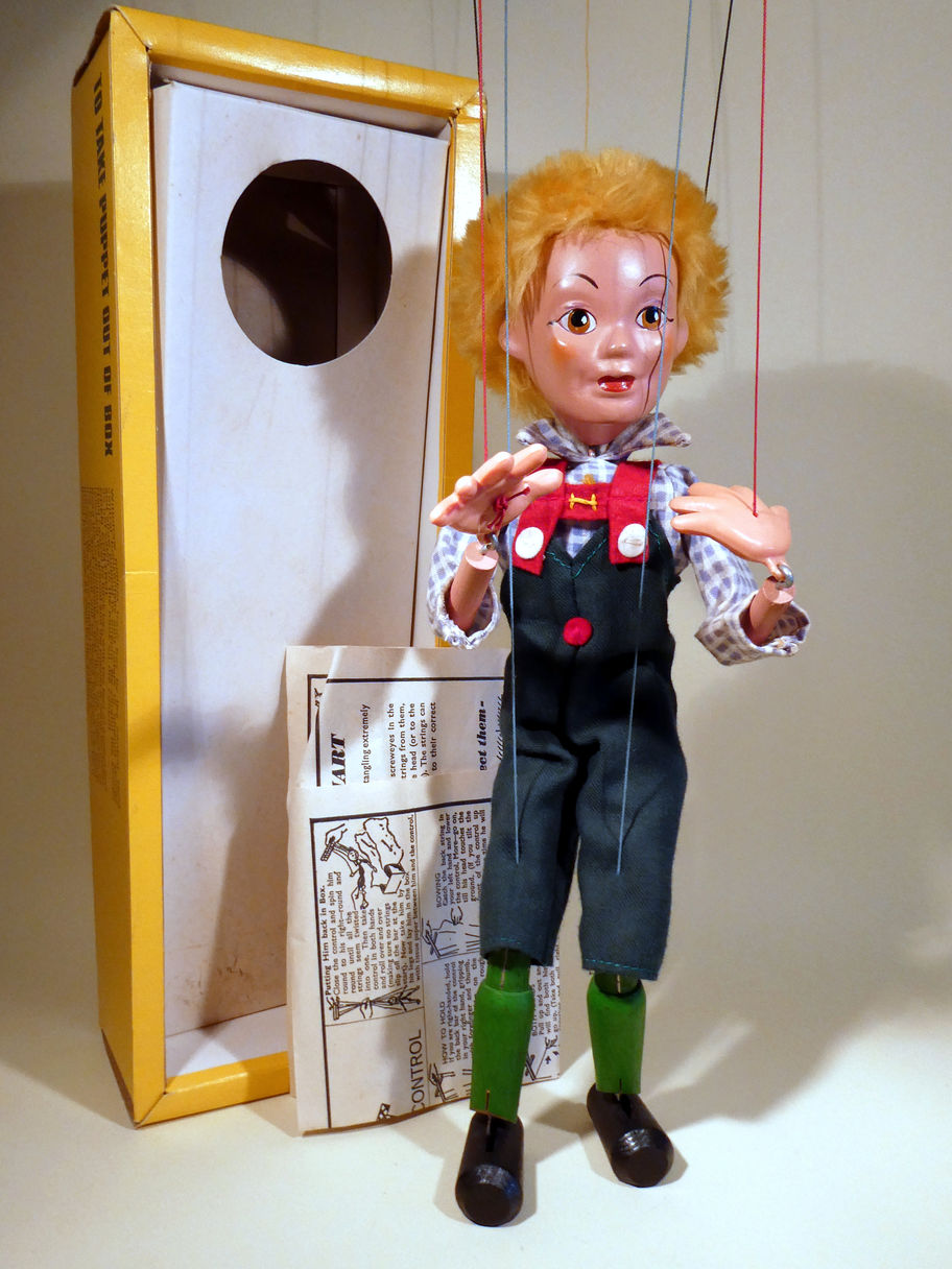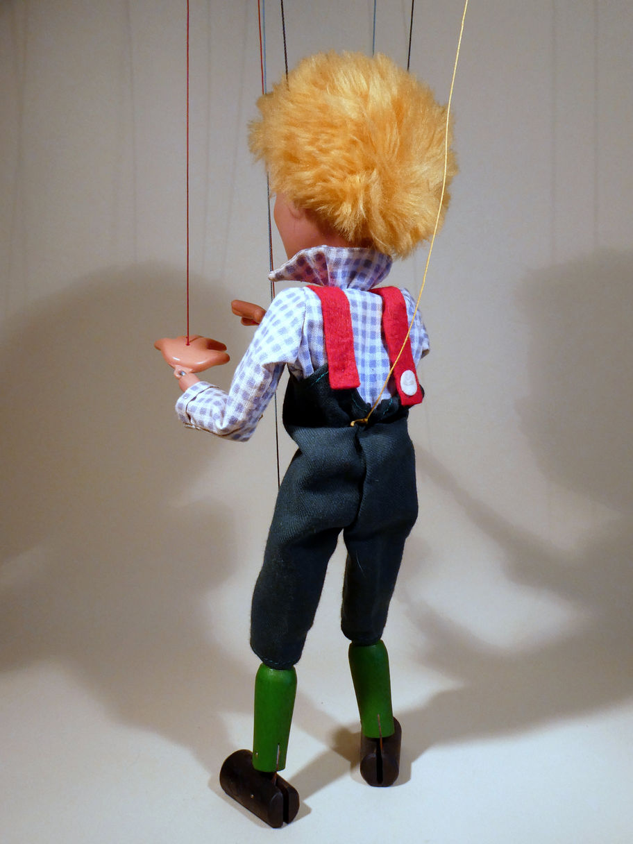 He has lost a white felt button on the back of his trousers.