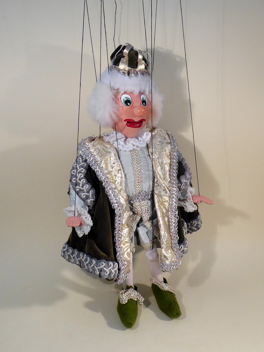 "Leopold" is the King who married henriette. He has a fantastic outfit, with highly decorated detail as seen by images. He has clothes made to very high theatrical standards of costume design. Strung on 24" black strings on a coloured buffer Pelham control. The control has Queen written on it. This is a redressed repurposed puppet. Please see images for description of the outfit