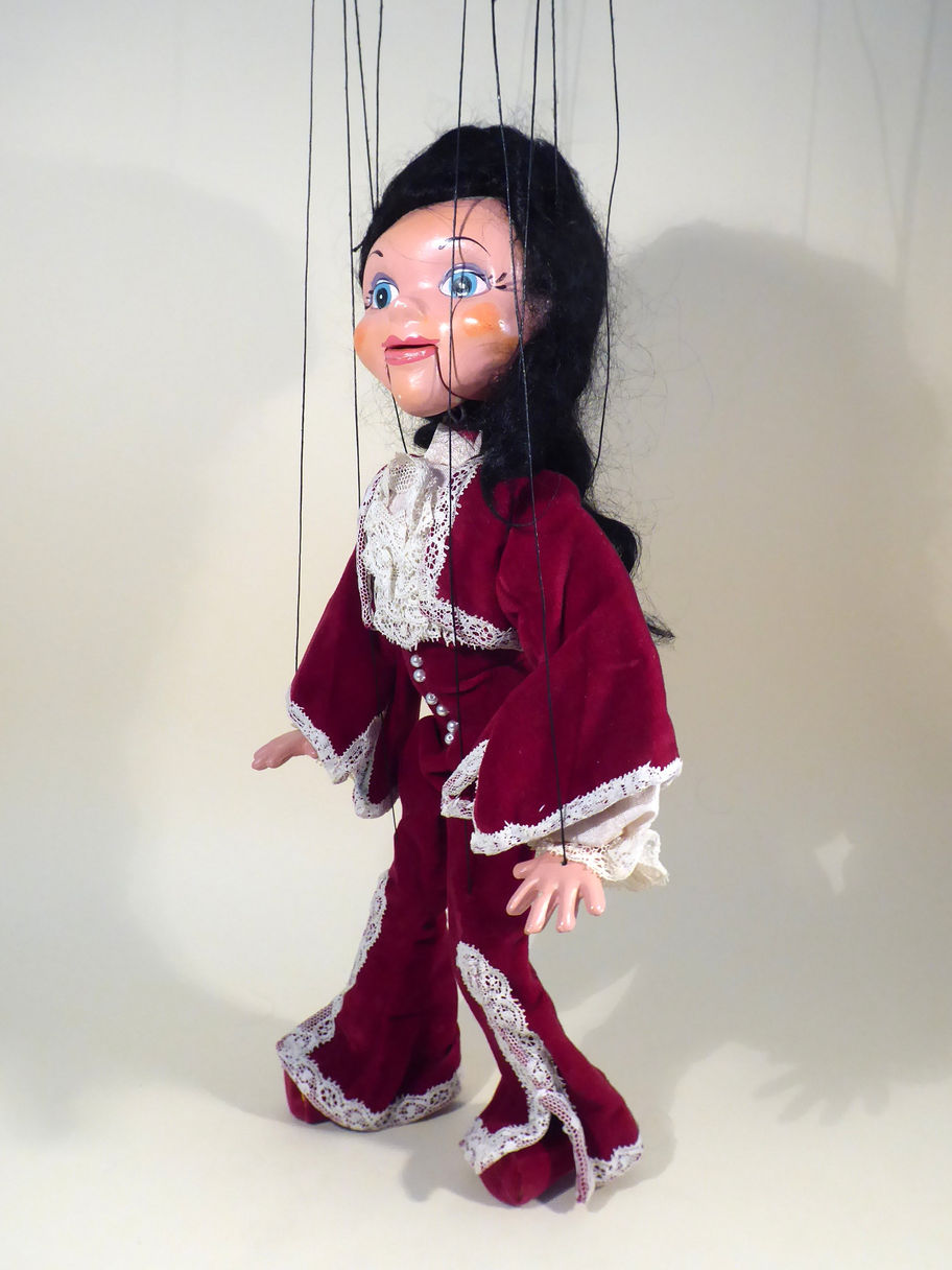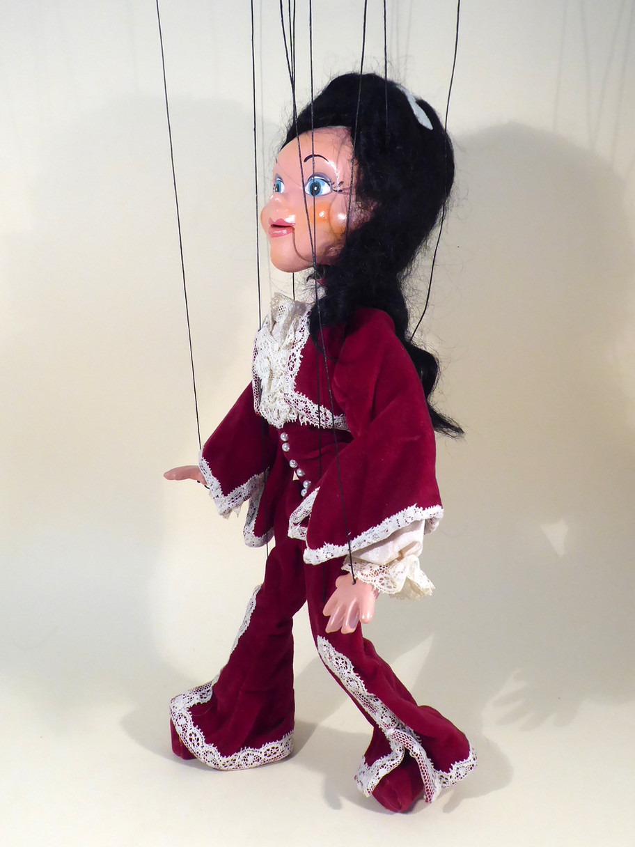 "Marie" has a costume typical of the late 70's. She models herself on Marie Osmond. She has clothes made to very high theatrical standards of costume design. She wears a trouser suit of pink velvet with white lace ruffle and trims. She has a hair style piled up of black synthetic hair. Strung on 30" black strings on a coloured buffer Pelham control. This is a redressed repurposed puppet. Please see images for description of the outfit.