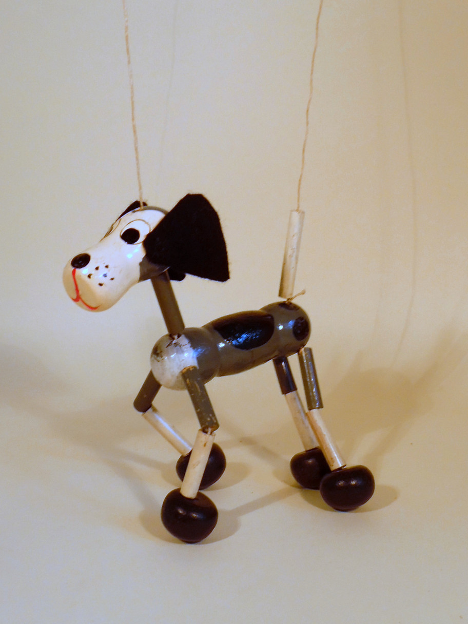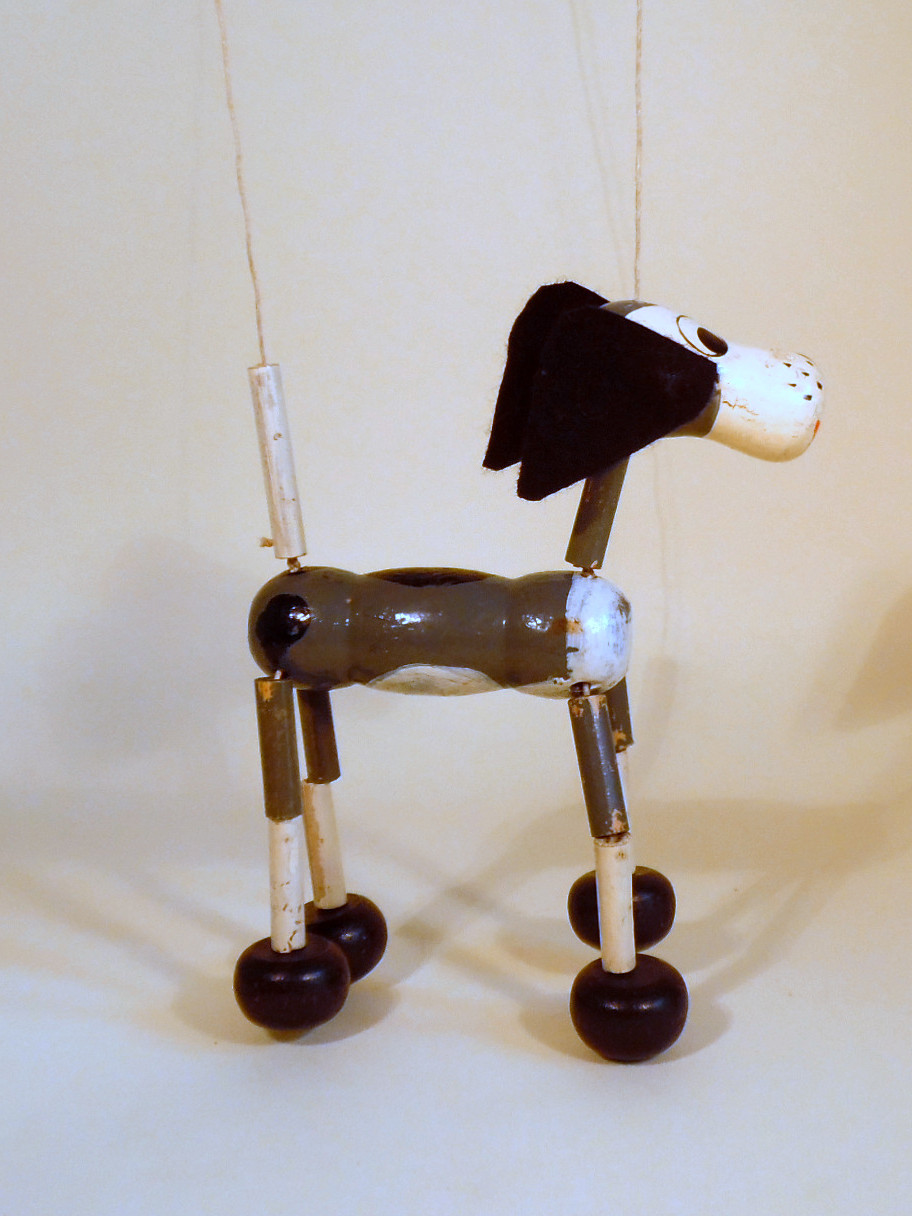 Caesar is a rare little character from the 1950's. He is a minipup puppet on two strings and one small control. He measures approx 4" (11cm) tall. This one is aged and looks to be re threaded or re strung. He is complete with the tail which is sometimes missing. He has some paint loss on his bamboo limbs as always happened, due to the paint not adhering to the bamboo surface.