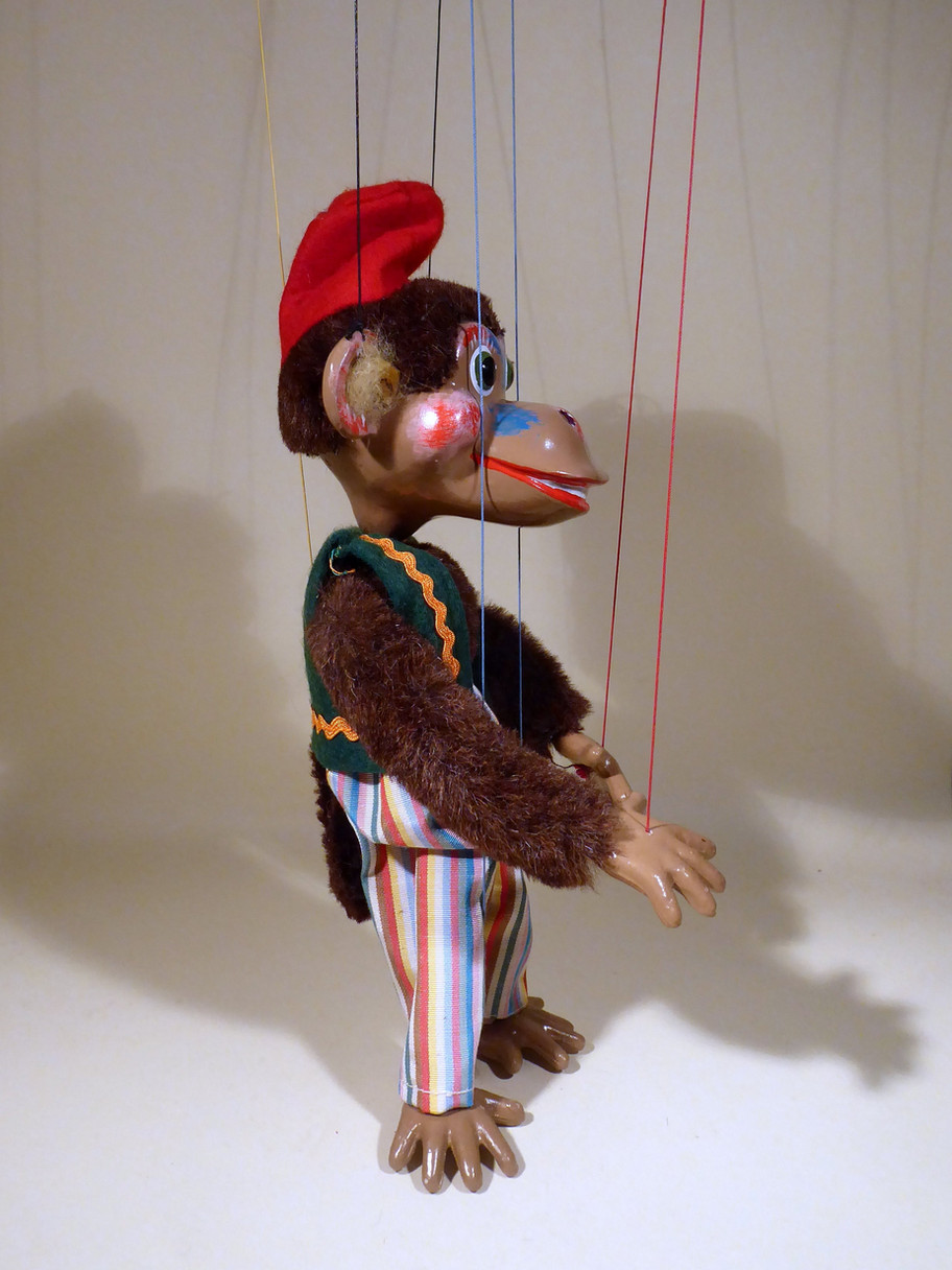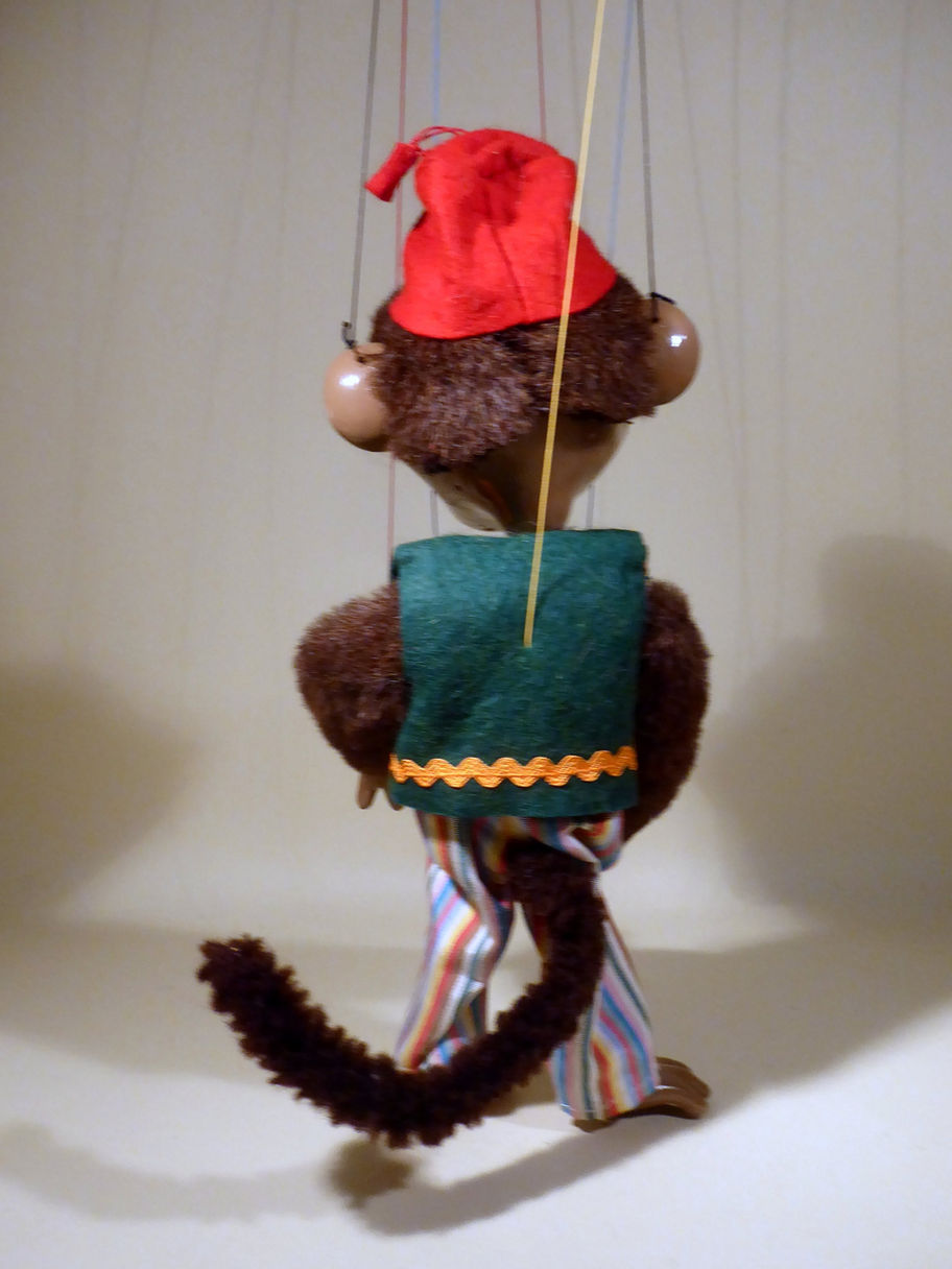 Type SL Monkey a rarely found character. Often thought to belong to the 1963 dressed animal range, this one is a 1965 designed puppet. He is in excellent condition with no damage or flaws. The gold fur patches by his ears are still good, often these have disintegrated with age. He has the bell on the end of his tail and red fez hat with tassel complete. The clothes are clean and bright, the multi striped trousers are very good. There were a few different striped material trousers on this character. The Monkey has all his toes and fingers intact with no restoration or breaks, a common fault with this puppet. The original box has no stamp just SL. Includes instructions with pre decimal Pelpop letter uncut.