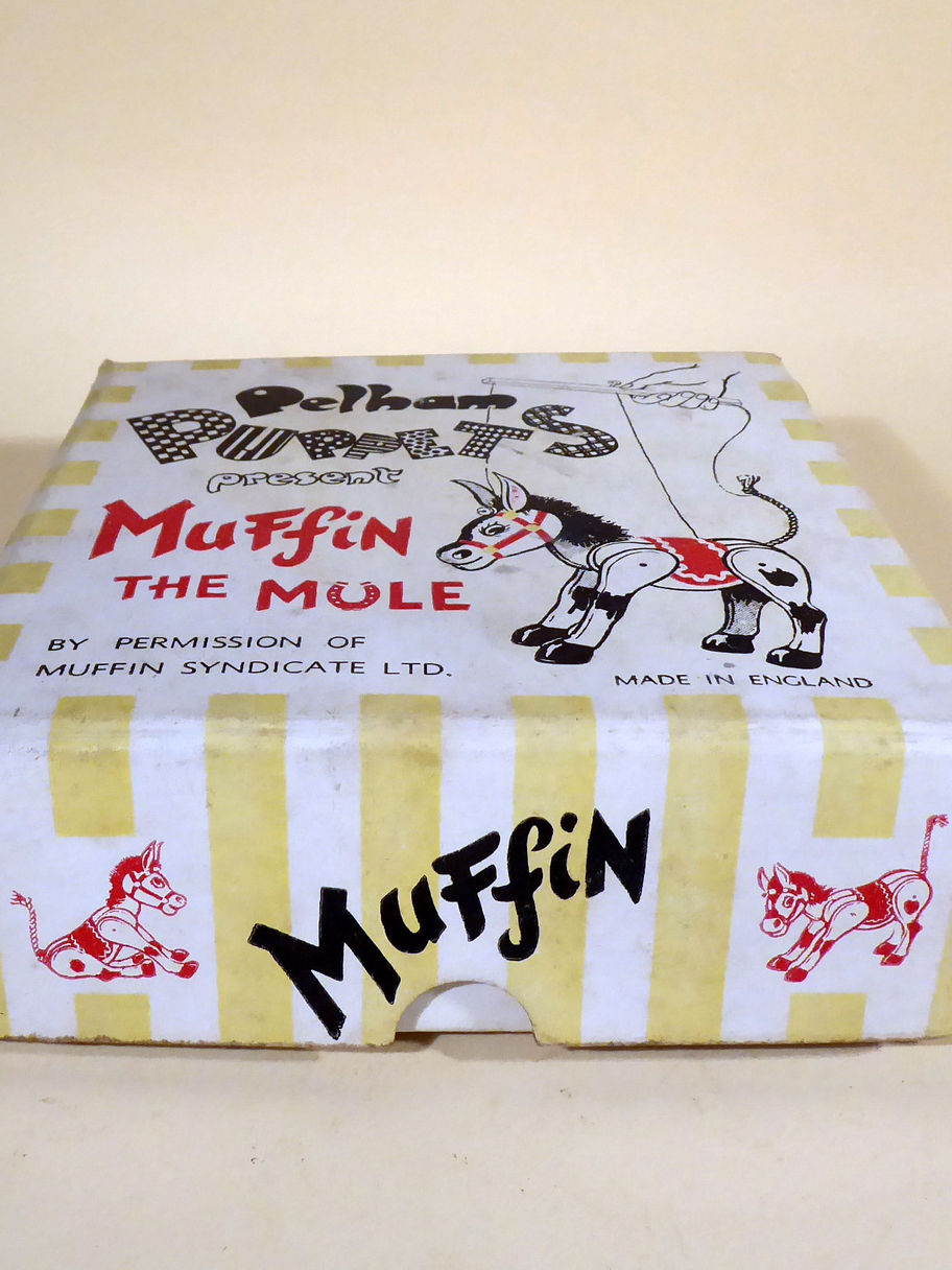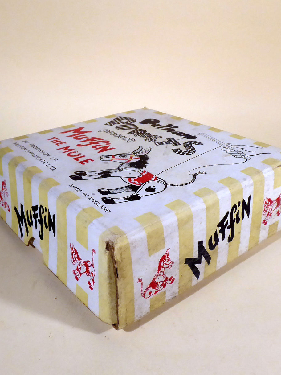 Muffin dates to 1950's with the suedette material saddle, rather than the later synthetic material. He has some paint wear and chips to the hooves consistent with age and use. He has no damage or breaks and has both original ears intact and also his brown fur mane, slightly thinned on the neck piece.The elastic between the limbs is still taught enough for him to pose. The original bell is still attached and it looks as if the elastic is the original. Box is the first style square box used only for Muffin. It is aged with a split at one corner.