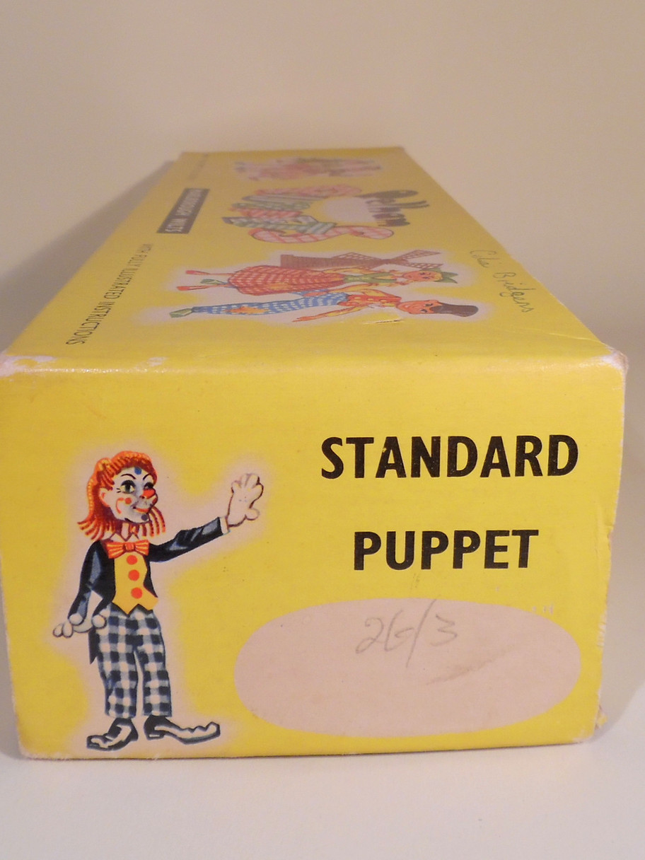 Muffin the Mule is in very good condition. He has a good saddle made from the same material as saddle of the horse. This is the second version of the puppet re introduced in 1970's. He retains his little bell and both ears are good. He poses well due to the elastics not having perished over time. He has a pretty pink toned fur mane. The long box is unstamped, he would usually be in a small yellow animal box or the first versions in a square Muffin the Mule box. The box is in good condition.