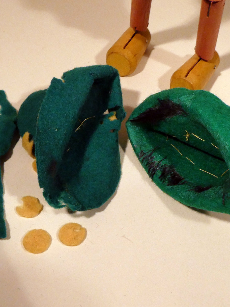 A previous owner has made a new felt hat, braces and felt buttons, the old ones were moth damaged but are all included with the puppet. These were all in the box when he arrived to me.