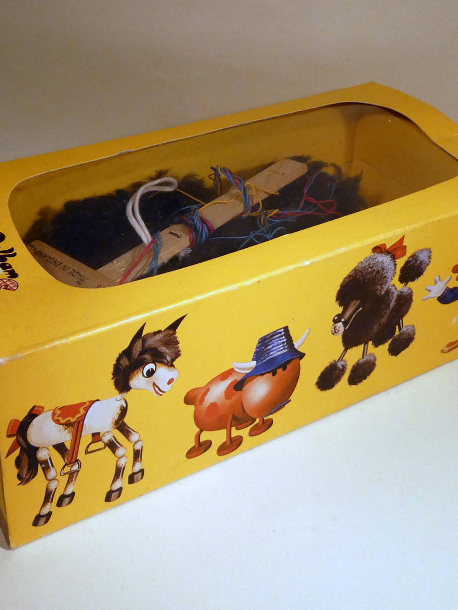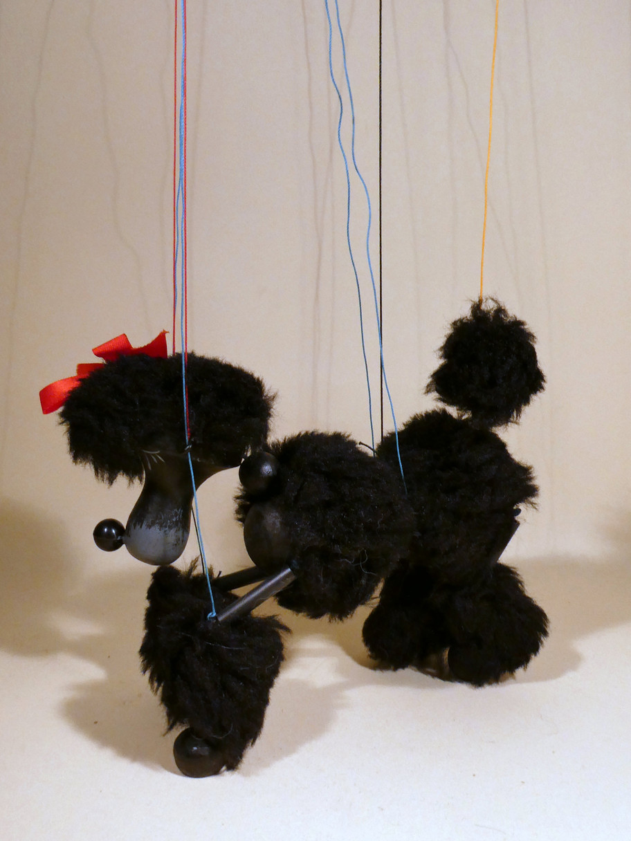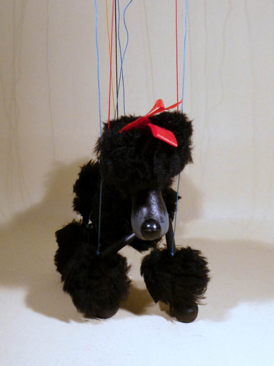 Type A Black Poodle with synthetic fur hair and bow on the top of her head.