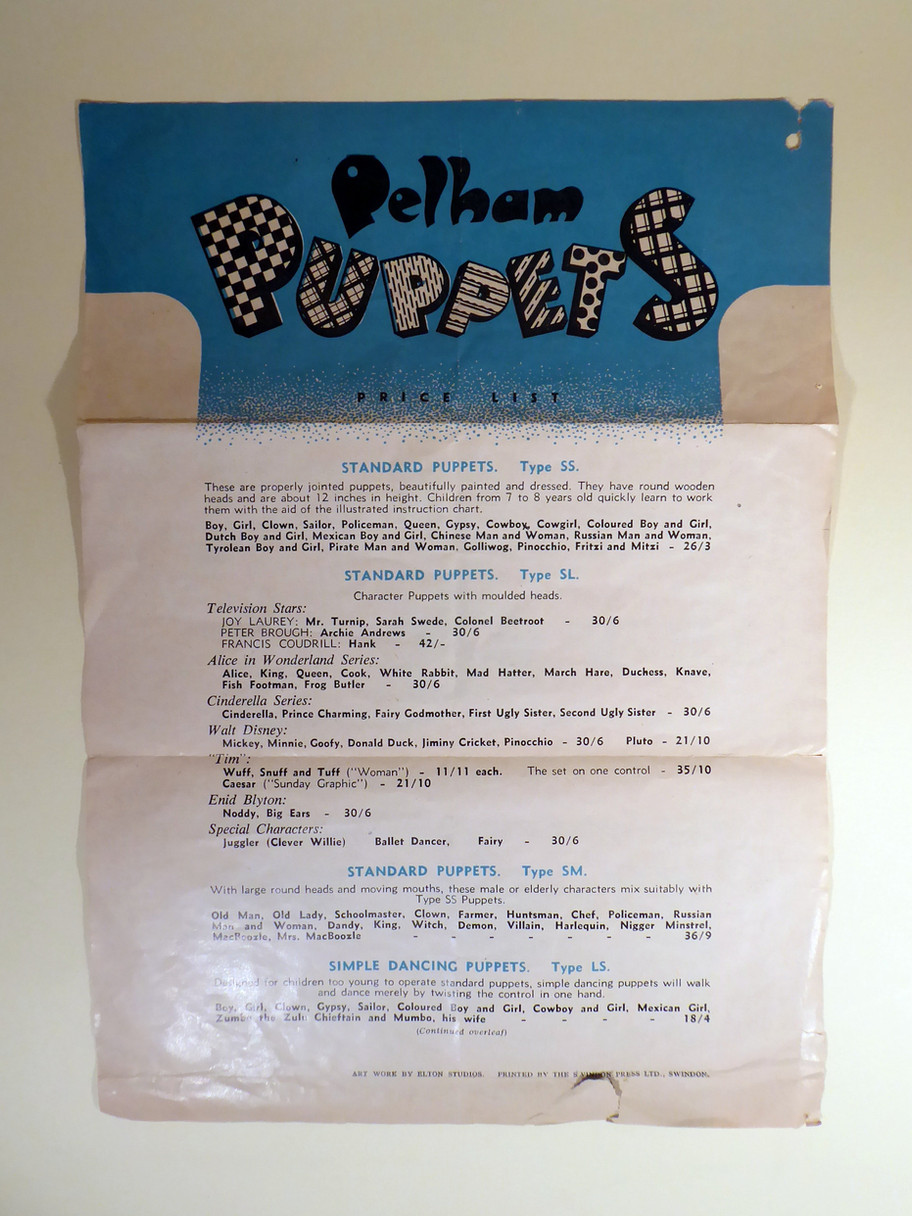 Price list from 1950's. One sheet folded as seen by images. It is worn and aged. Prices are shown for the first puppets available for sale.