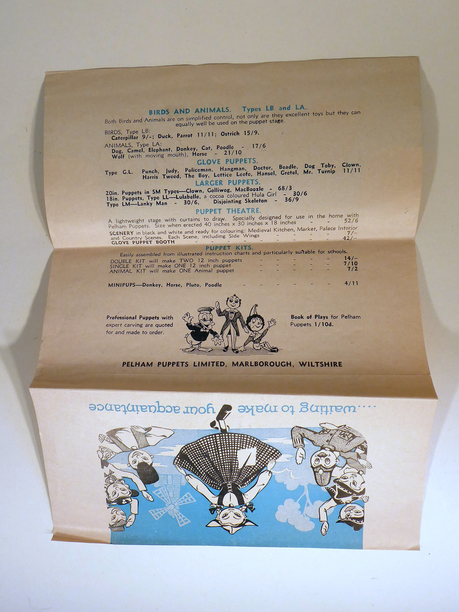 Price List for Pelham Puppets. Single sheet measures approx 7.5" x 10". The paper is in good condition with folds/creases as shown.
