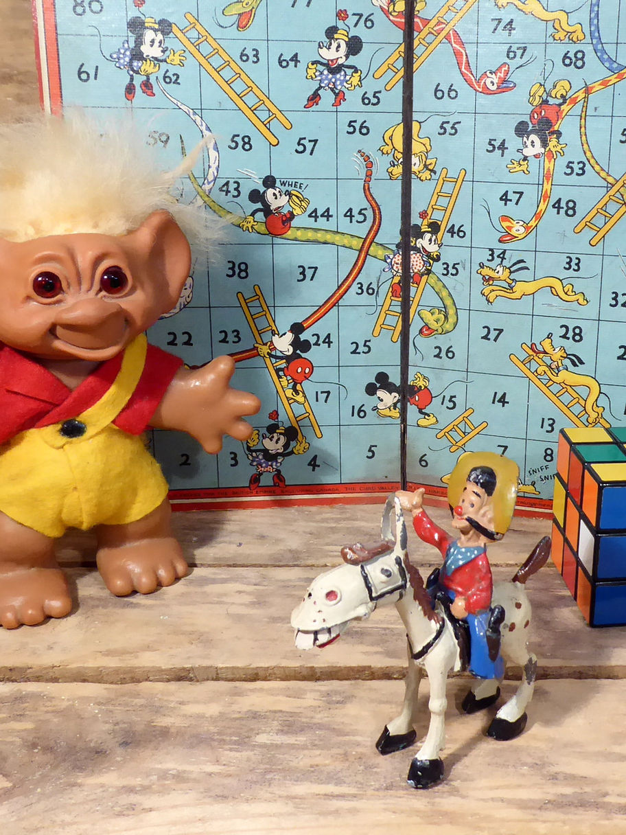 Hank the Cowboy was written by Francis Coudrill's for Whirligig, a children's TV programme that started in the 1950s. This is a rarely seen lead figure of Hank with his horse Silver King made by Sacul, England. The Sacul name was discontinued in 1954. He is wearing blue trousers with gun belt, red shirt, blue neck scarf and brown cowboy hat. He can stand independently but is designed to sit astride his horse, Silver King. Both lead figures are in excellent condition, usually these have much more paint loss than this one and can suffer cracks too. See images for close up views. England is impressed on the underneath of the Silver King. Size is approx 3" x 3"