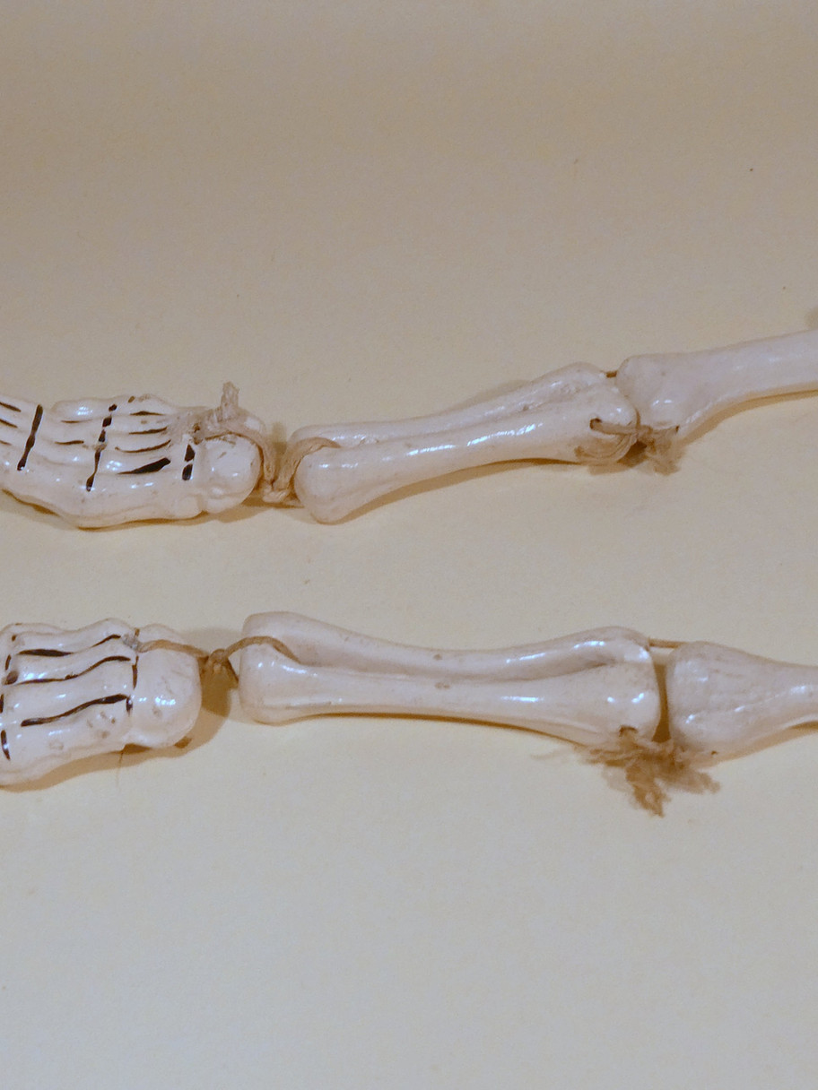 On the skeleton, hands are attached with one looking upside down.