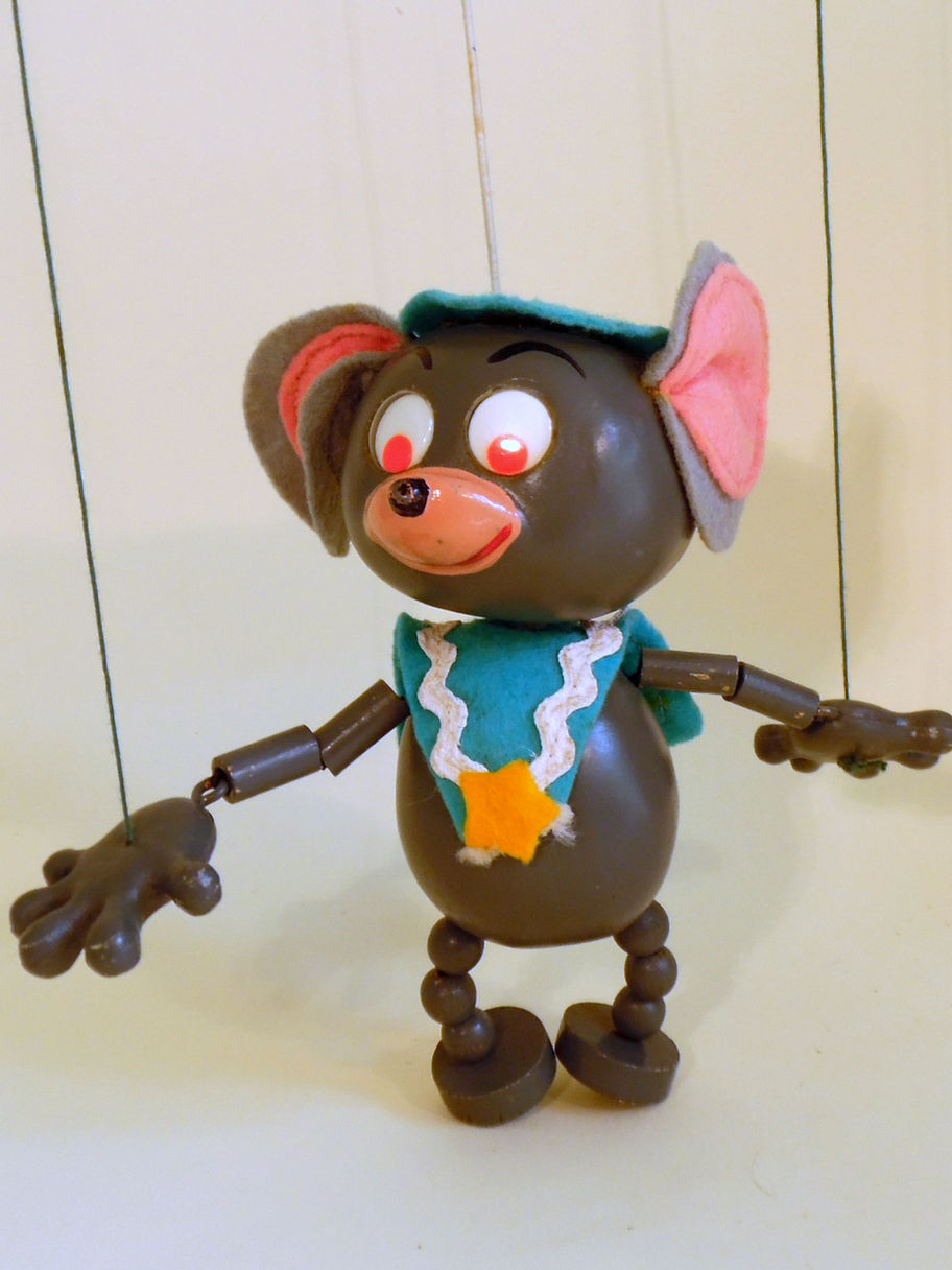 Special Mouse with google eyes, that move behind the plastic covering. Fair condition with stain to felt beret and a single small hole in the back of the felt tabard. Comes in original box with 'Special Mouse' sticker on the end. 1970's rare version of the Mouse.