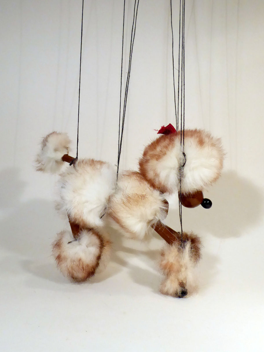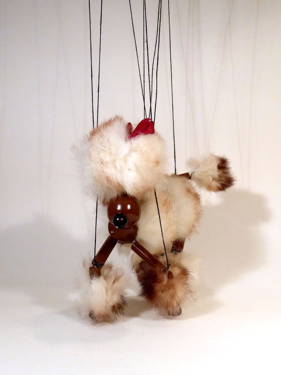 Type LA Brown Poodle with rabbit fur hair which is tinged brown. He retains the red bow in his hair. The fur is shedding slightly but is not too thinned. The brown painted bamboo could have been repainted at some stage as it doesn't seem to have any loss which is unusual with this character. Strung on flat T bar control. He has white painted sleepy eyes under his fur hair. Box is correctly stamped and in shelf worn condition.