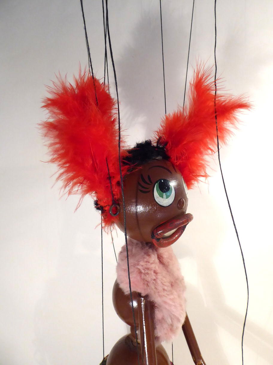 Type LL Lulabelle dating to 1950's. She has some condition issues. The puppet should be strung on coloured strings on the small control with buffers, but she is strung on a handmade control with black string. She has both maracas but one is repainted, they are not damaged otherwise. One long bamboo leg (right) has clear tape around the lower part to hold it together I assume, it's old tape. She has brass rings around her ankles which are aged. The fur stole is good just a little dusty etc. She has synthetic fur hair which looks as if it has been cut and is damaged, I have lightened an image to view more easily. The red full feathers must be replacements judging by the rest of the condition of the puppet! These are stapled on to the head. The grass raffia skirt is good, just a little aged. The face paint is quitegood with rubber lips. The original box is shelf worn.