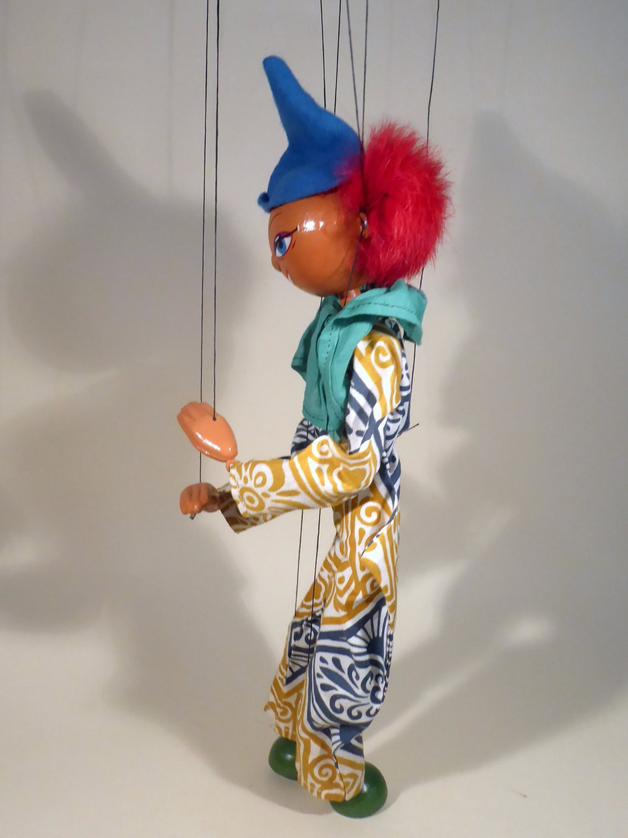 Type LS Clown with lovely bright red fur hair in full condition! He has a sweet face which has some minor paint loss on the metal pin nose. Clothes are good. The felt hat is good. He has bamboo limbs and large composition hands. The original box is stamped correctly and is in good used condition.