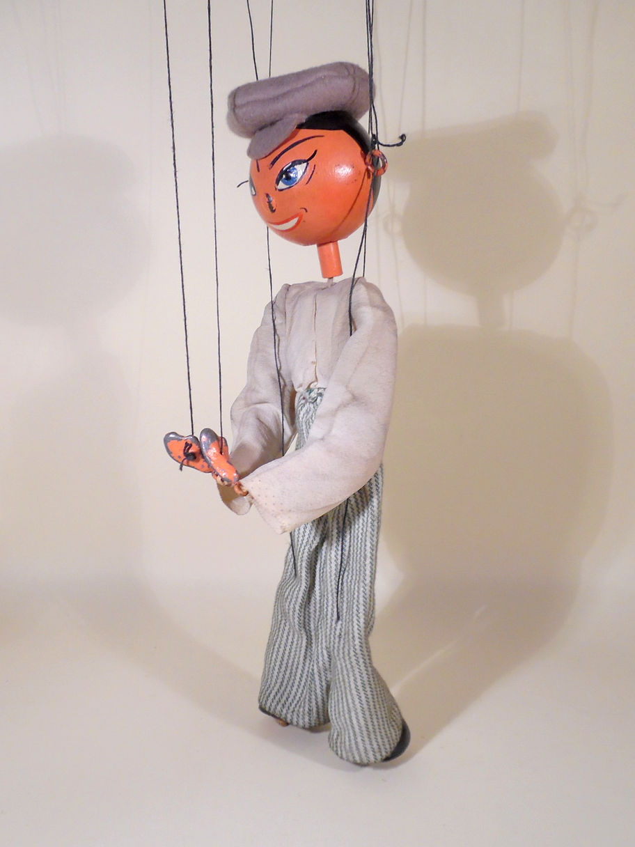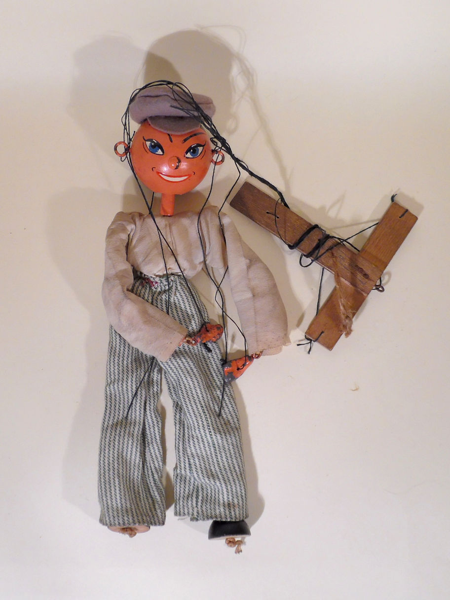Type LS Cockney Boy a rare puppet with very thick felt cap. He has painted black hair and small lead hands. He has paint loss to his nose and is in aged condition as seen, clothes are worn and grubby. No box.