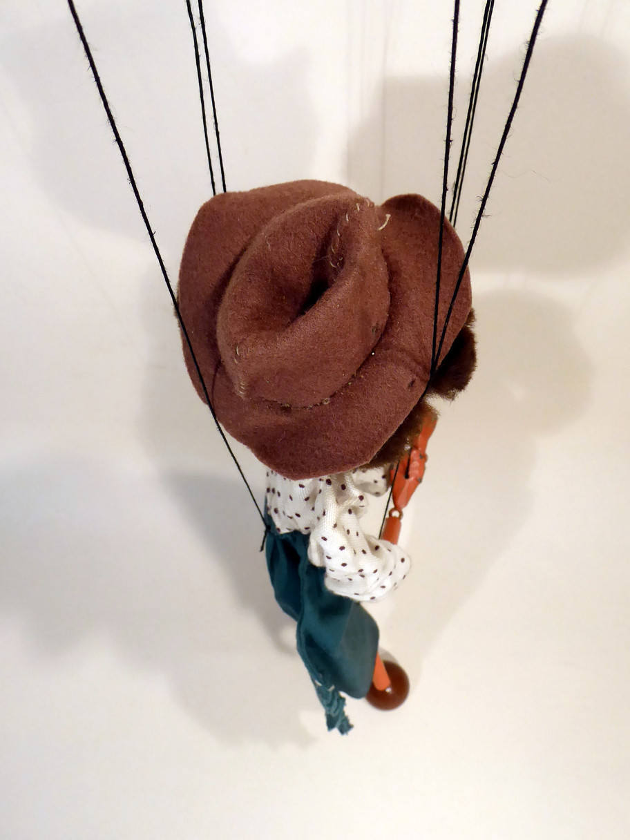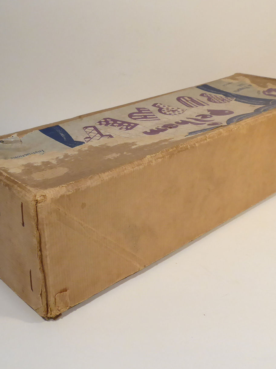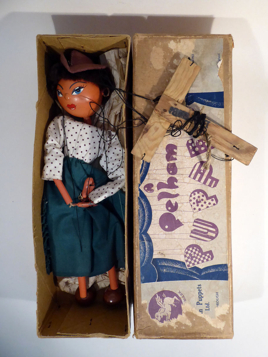 Type LS Cowgirl with lead hands and rabbit fur hair. She has very good clothes with no damage. The thick 'chaps' trousers are wide and good with a fringe down the side. The blouse also good. The thick felt stetson is good with a small hole in the felt as seen in the above image. The paintwork is very wood, she has no loss on her nose and the bamboo limbs have retained the paint very well. Her drop lead hands also are good. One shoulder is raised, this is probably just from how she has been put together, or storage. The box is in good structural shape but the label has damage as seen. It is stamped Cowboy so it not correct for this Girl.