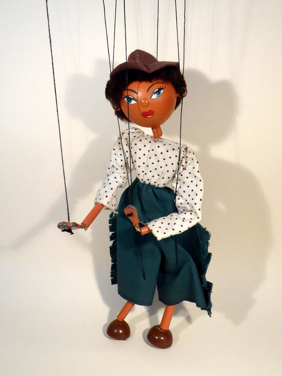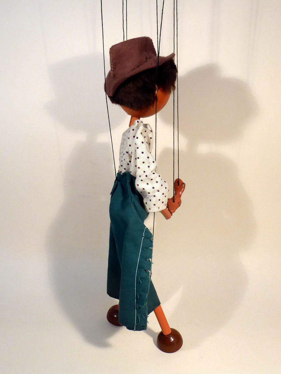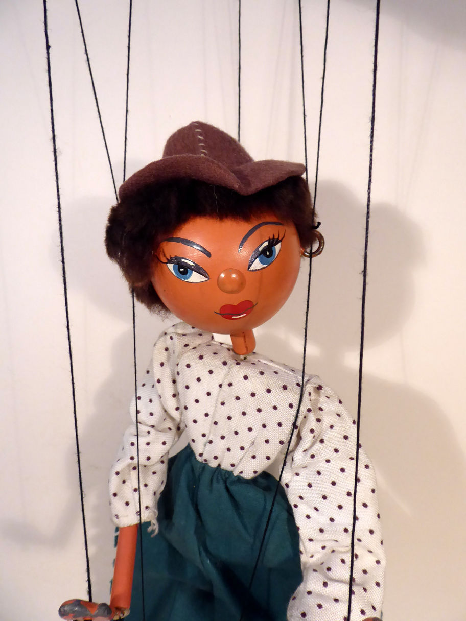 Type LS Cowgirl with lead hands and rabbit fur hair. She has very good clothes with no damage. The thick 'chaps' trousers are wide and good with a fringe down the side. The blouse also good. The thick felt stetson is good with a small hole in the felt as seen in the above image. The paintwork is very wood, she has no loss on her nose and the bamboo limbs have retained the paint very well. Her drop lead hands also are good. One shoulder is raised, this is probably just from how she has been put together, or storage. The box is in good structural shape but the label has damage as seen. It is stamped Cowboy so it not correct for this Girl.
