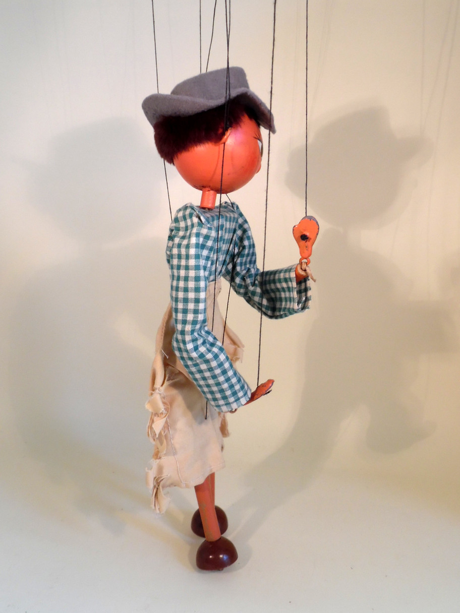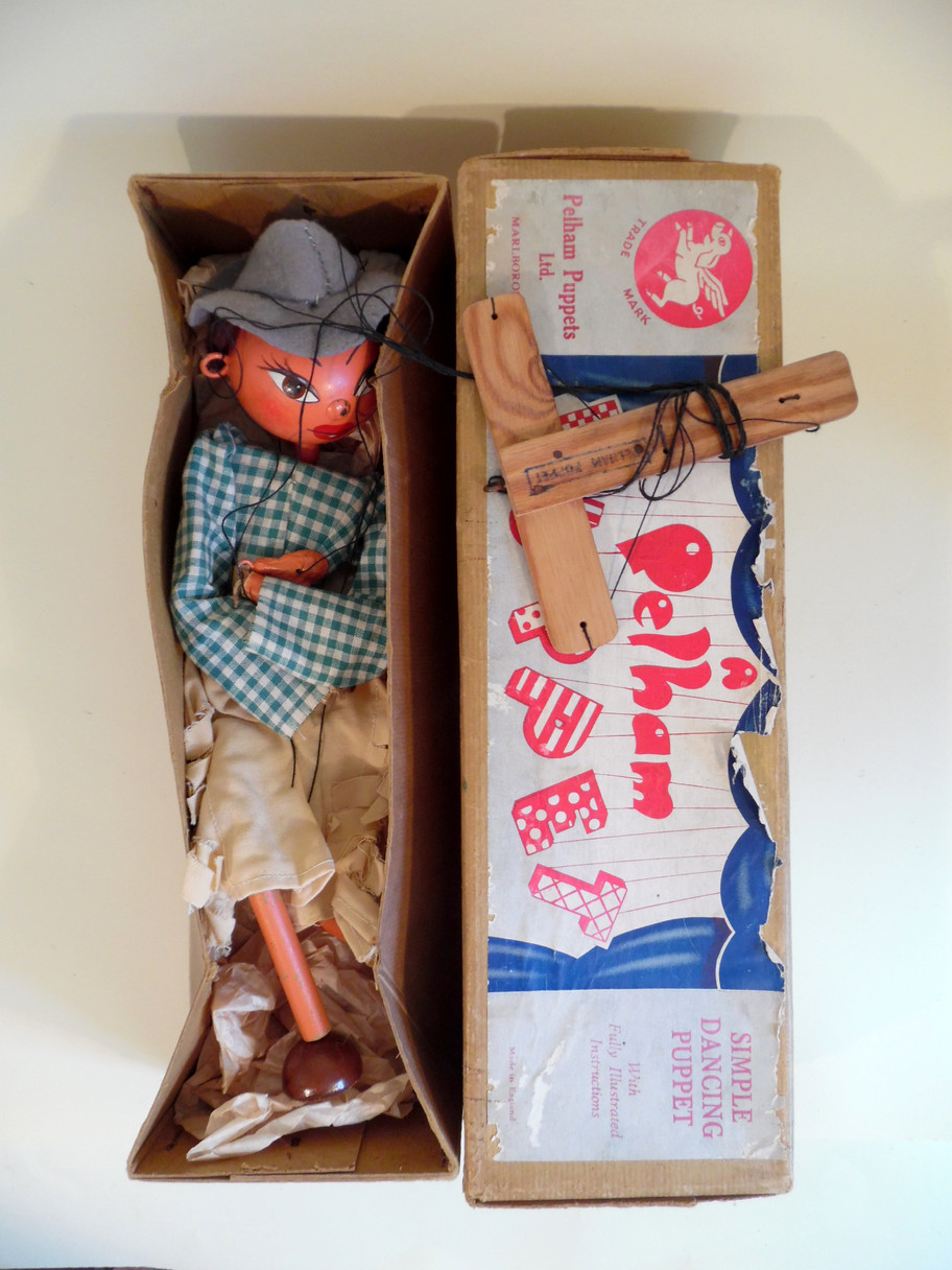 Type LS Cowgirl with small lead paddle hands. She has a very sweet face with some paint loss on her metal pin nose. The clothes are in good condition, her real fur hair is good. The grey felt hat has a small moth nibble. The brown box is poor, the lower part not matching the top.