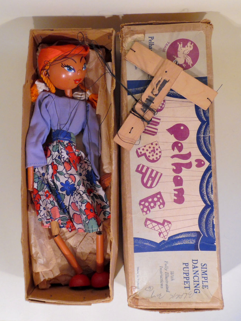 Type LS Girl, in very good condition with a lovely coloured costume and red rope plaits. She is clean and bright all over. She has lead hands and bamboo limbs. Box shelf worn with tape marks and a split, with a set of instructions. The box is stamped one end and has writing on the top as seen.
