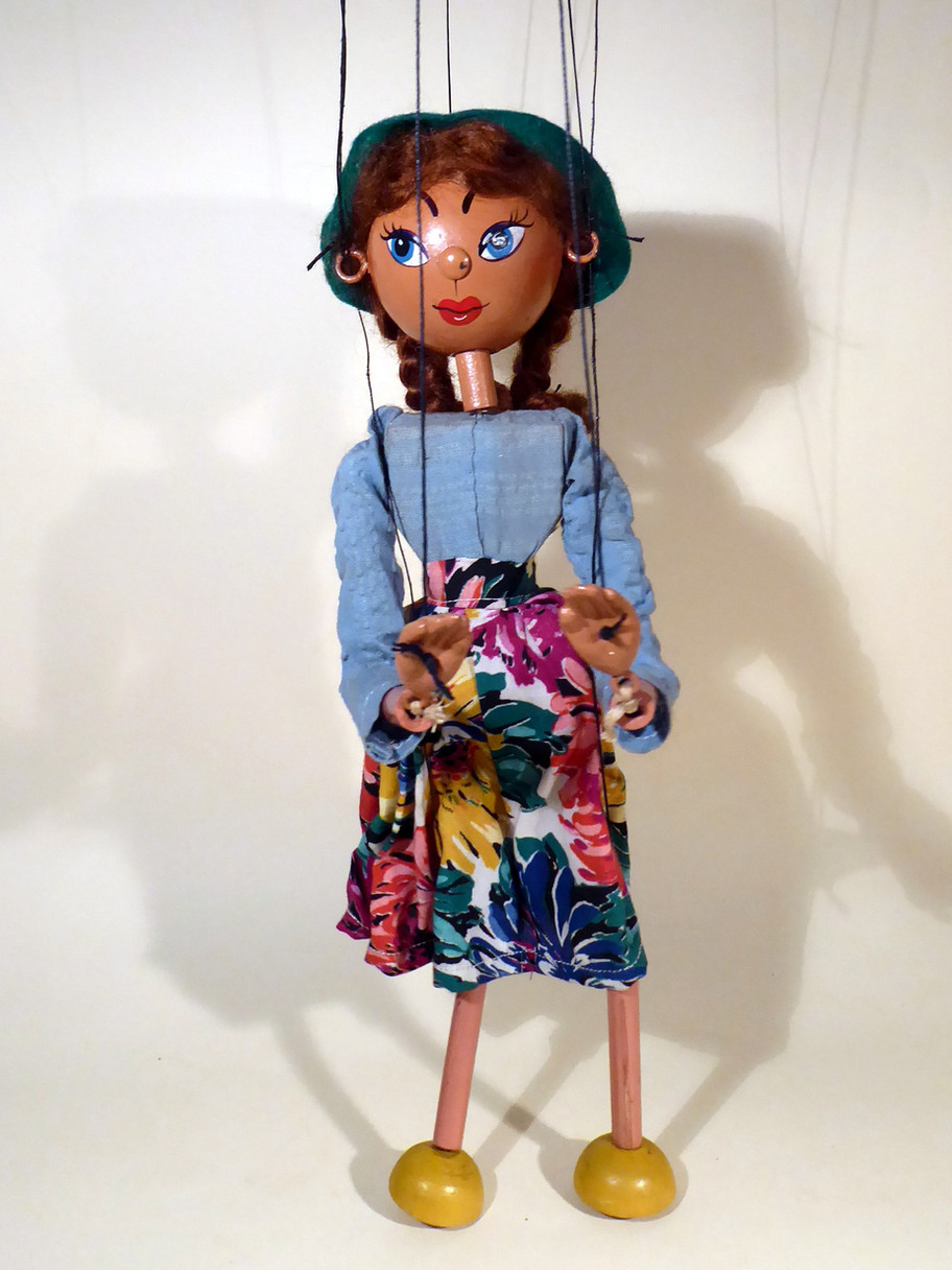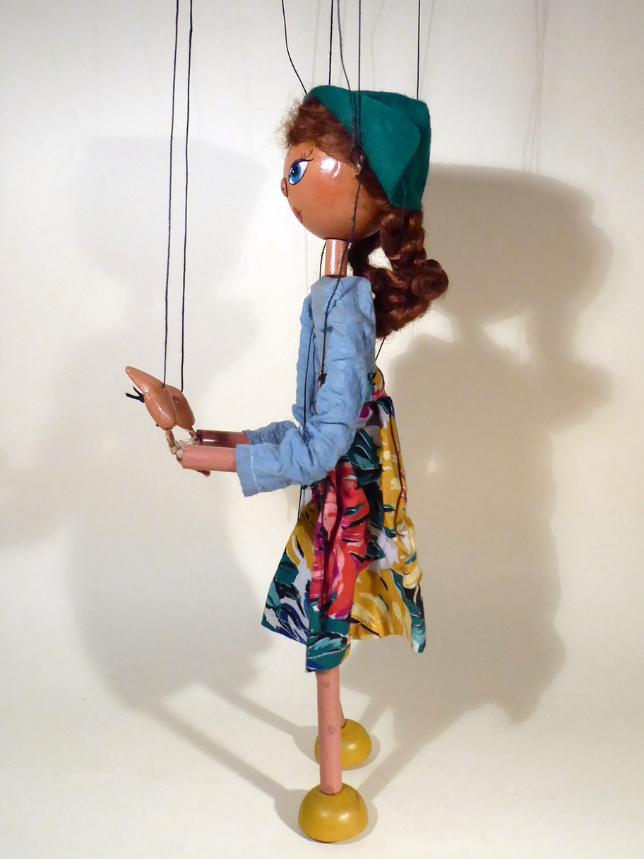 Type LS Girl 1950's. She is in used condition, her hair has been retied into plaits with thread, ribbons are missing. The felt hat has some minor moth holes as seen. She has good face paint but a tiny hairline in the wood under the metal nose pin as often happens.There is also a spot of paint loss on the nose. The cotton skirt and blouse are in good condition with general ageing. She has small composition hands and round half ball feet with bamboo painted limbs. The original box is stamped and is in poor used condition. Instructions are included.