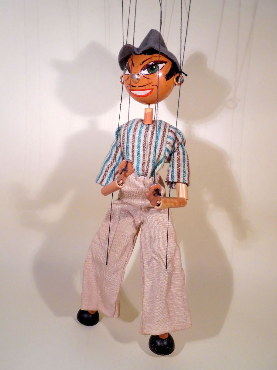 Type LS Mexican Man from late 1940's period with small lead hands and large bamboo limbs. His thick shirt and trousers are good the trousers have damp stains on them as seen. The felt hat has some damage at the front especially. The nose pin has paint loss as seen, he is an unusual puppet, rarely seen. LS Mexican Girl also available. No box.