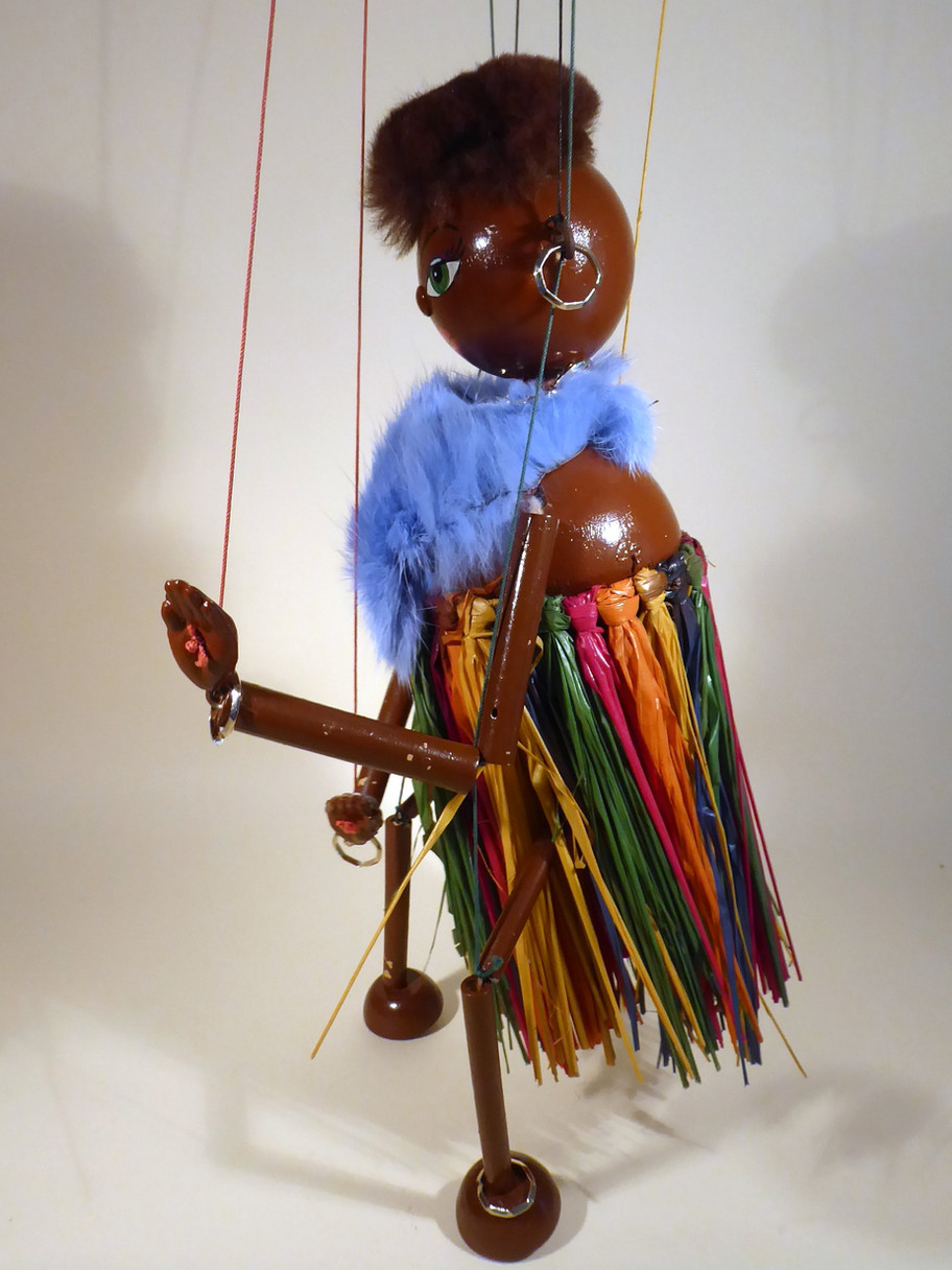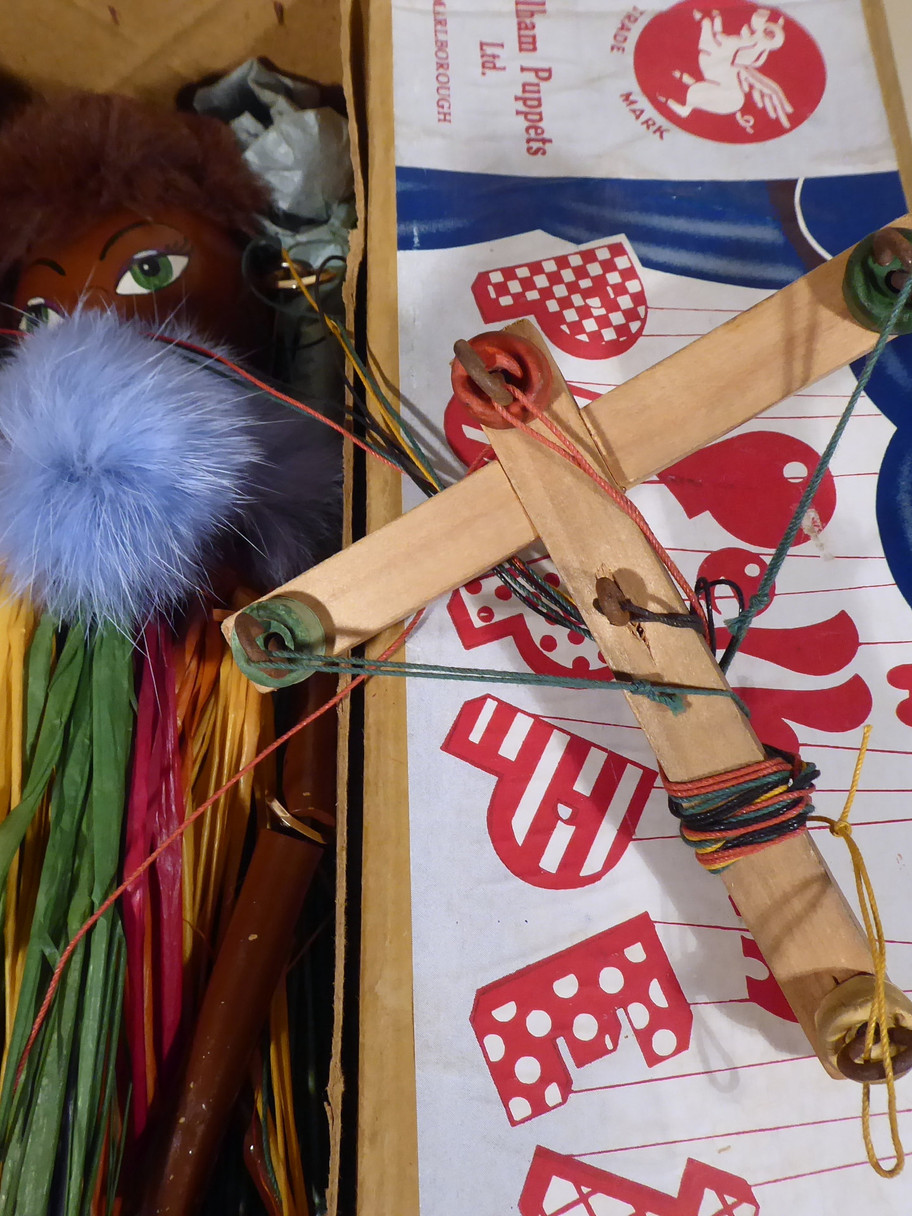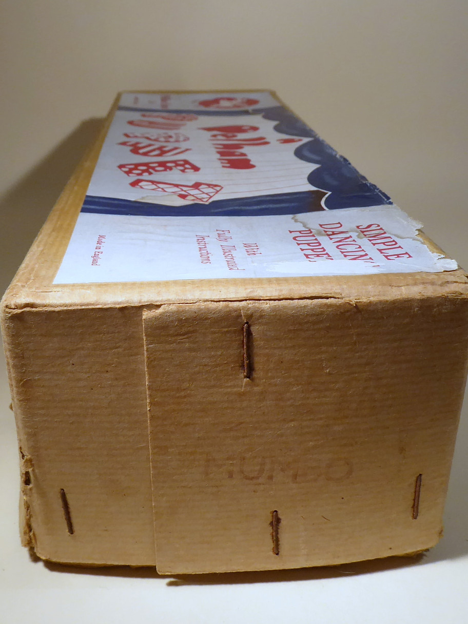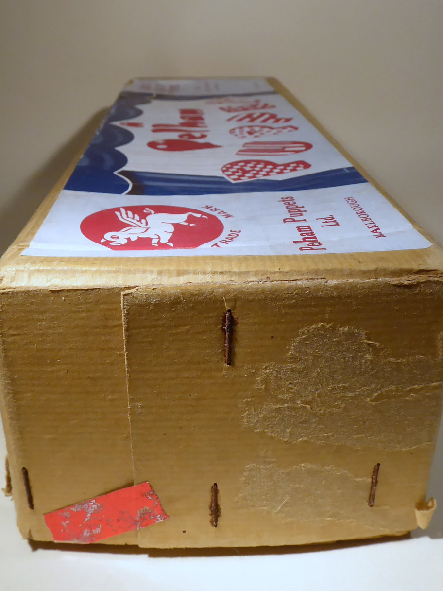 Type LS Mumbo 1950's era, she is the wife of the chieftain Zumbo. She has had some added bracelets, anklets, earrings and a necklace, easy to remove. She is missing her original bangle and earrings which should be a brass ring and would have been added at manufacture. Some versions seem to have earrings and bracelets and anklets, others seem to only have earrings, so I am not sure what she is actually missing but she has no original rings. Grass rafia skirt is good and the fur stole is very good and full. Her fur hair is good and her face paint is good. Her right hand has had some damage and maybe repaired in the past. Strung on T bar with coloured buffers of the mid 50's era. Box is good and stamped correctly.