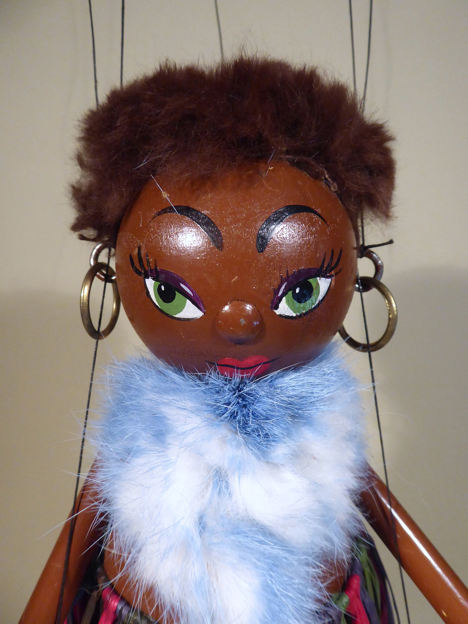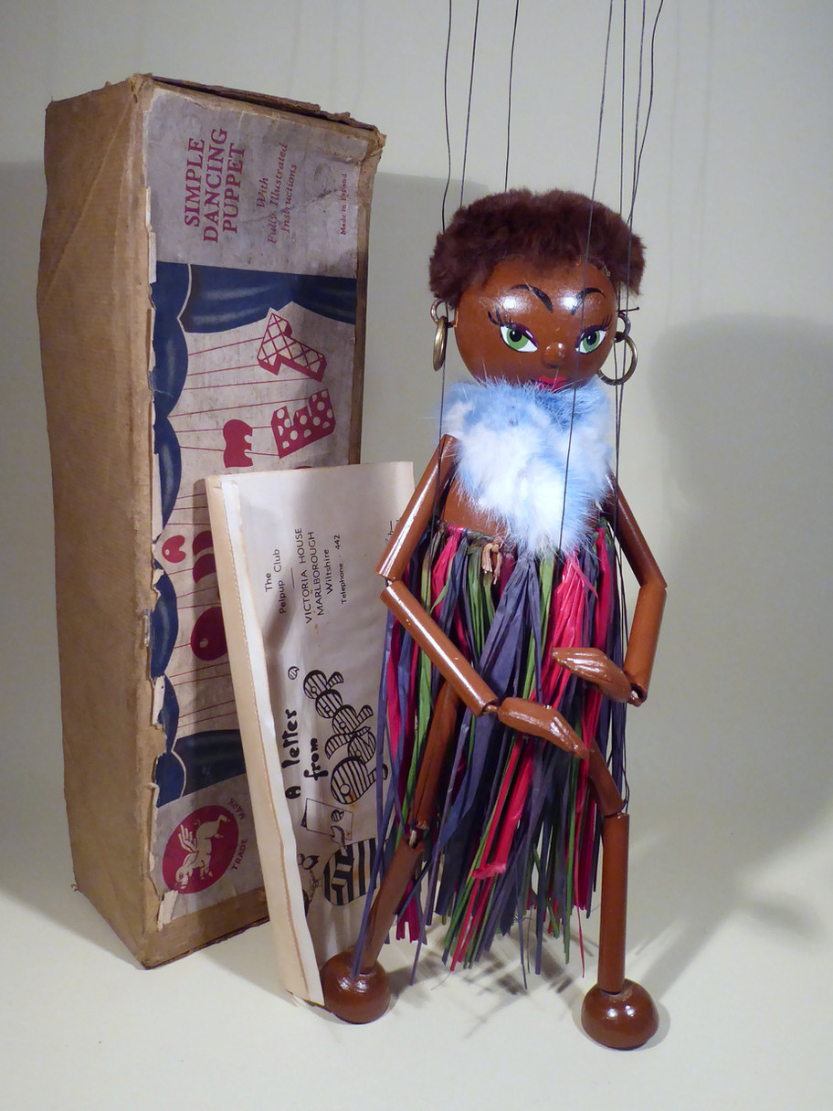 Type LS Mumbo with small composition hands. She has a beautiful face, and is in super condition. She has a good raffia skirt and pale blue fur stole. Her brown tuft of fur hair is good. She has her brass earrings. The puppet has virtually no paint loss on her limbs which often happens with this puppet and her face paint is very good with two tiny losses on the nose. The original box is stamped and aged. Instructions included.