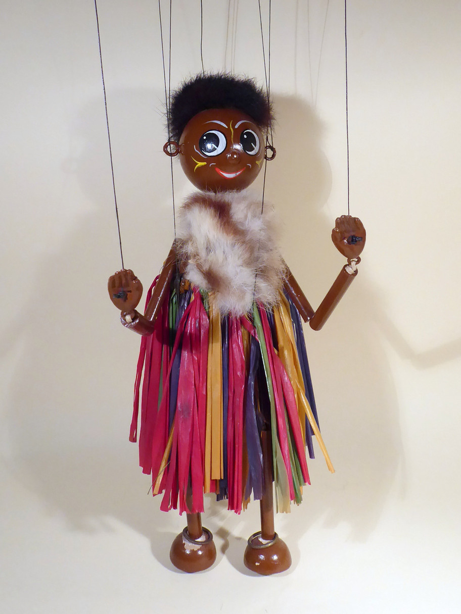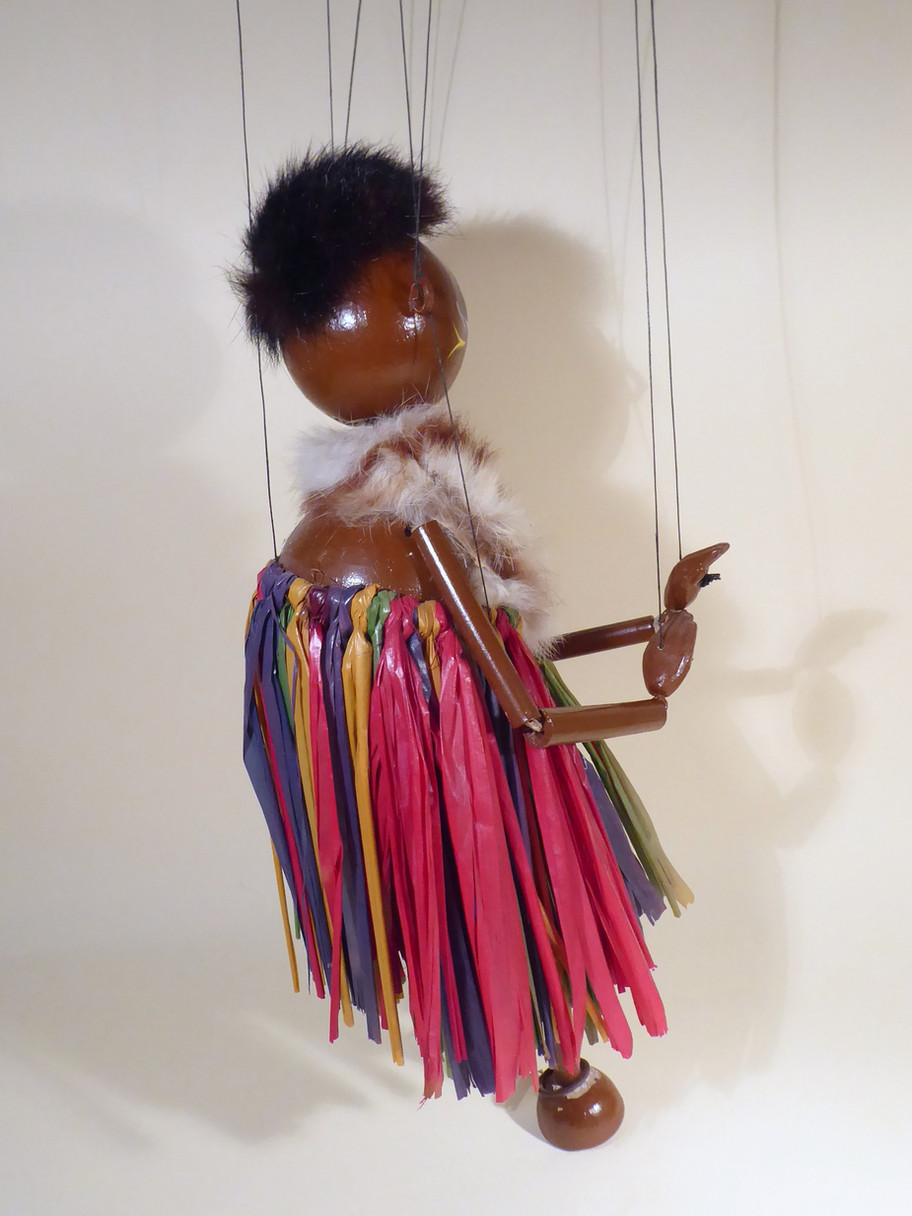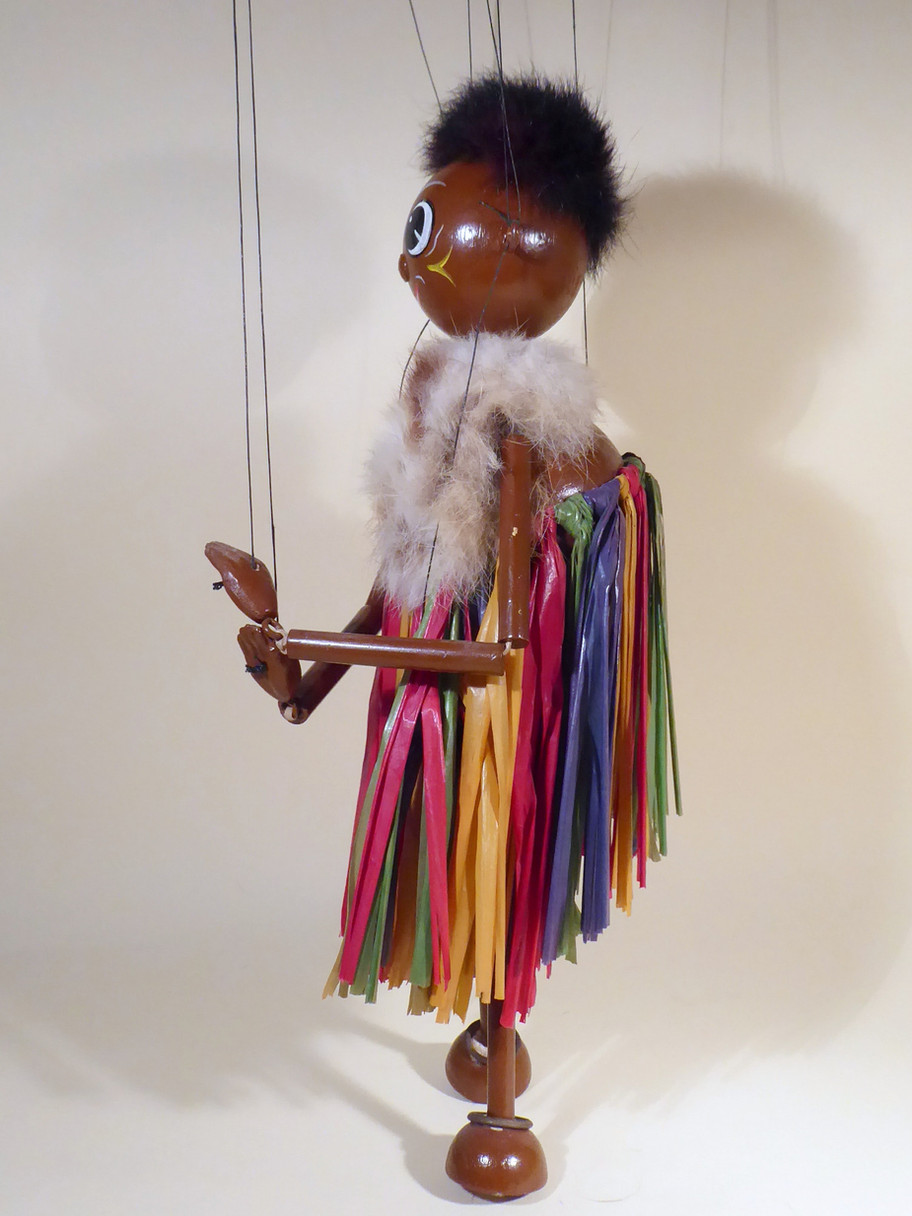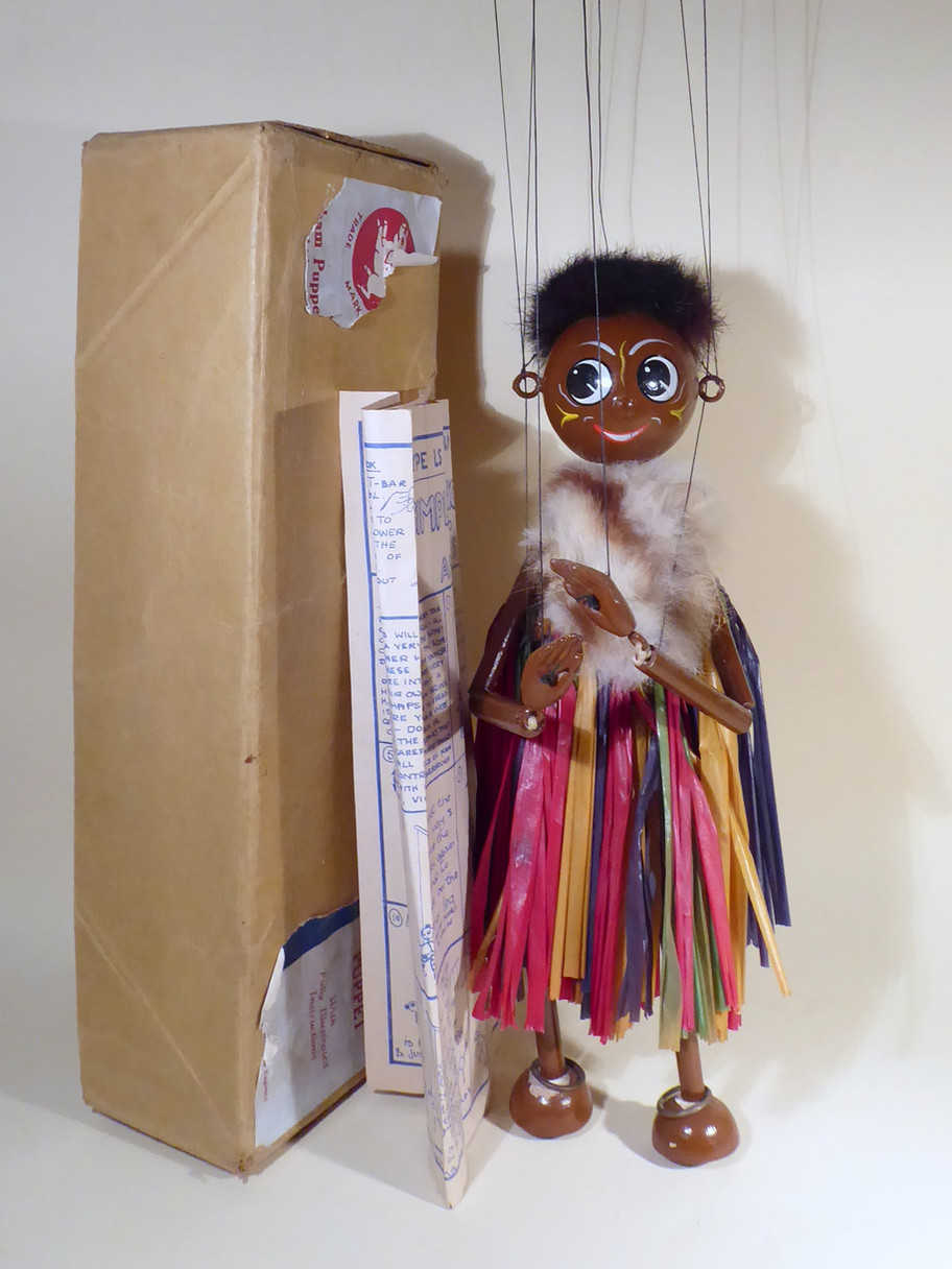 Type LS Zumbo the Zulu Chieftain from early 1950's. He is one of the rarer LS puppets to find and seems to be rarer than Mumbo possibly. He is in good used condition, just the fur is shedding. The raffia skirt is beautifully brightly coloured and the pieces are good. He has real fur hair which has flattened at the back from lying in the box. The fur stole is slightly shedding from ageing or moth damage. The difference between Mumbo, his wife, is the stole and the face paint. Zumbo has war paint on his cheeks. The fur stole is usually white and brown, sometimes plain brown. He doesn't wear earrings but has ankle rings. This version has composition hands and bamboo limbs, the brown paint has adhered well but there is loss around the half ball feet. There is a little bit of paint loss around the pin to the skirt at the back as seen. The box has a damaged label and wasn't his original box, the name stamp has been crossed out and his name handwritten. Instructions are included.