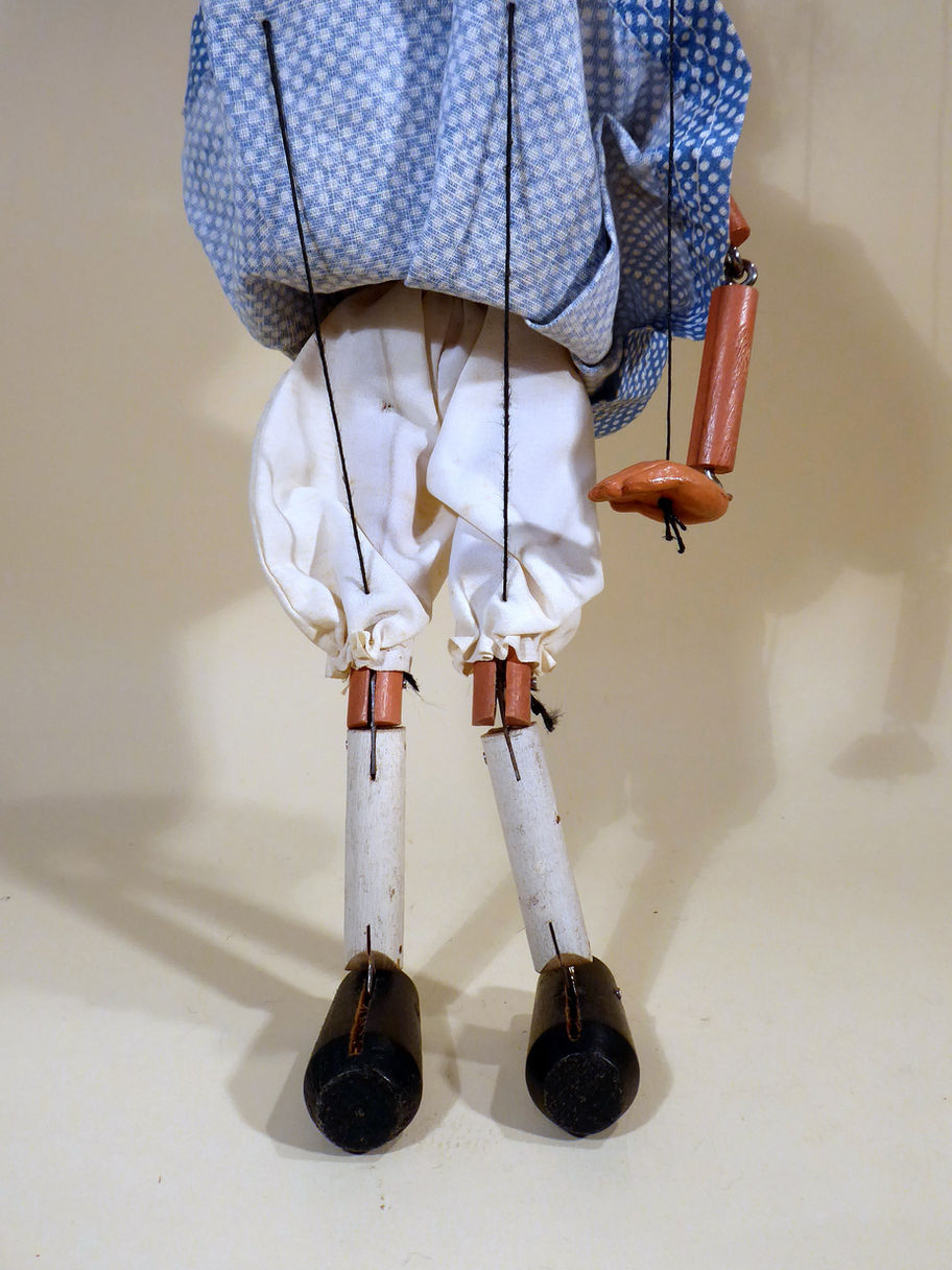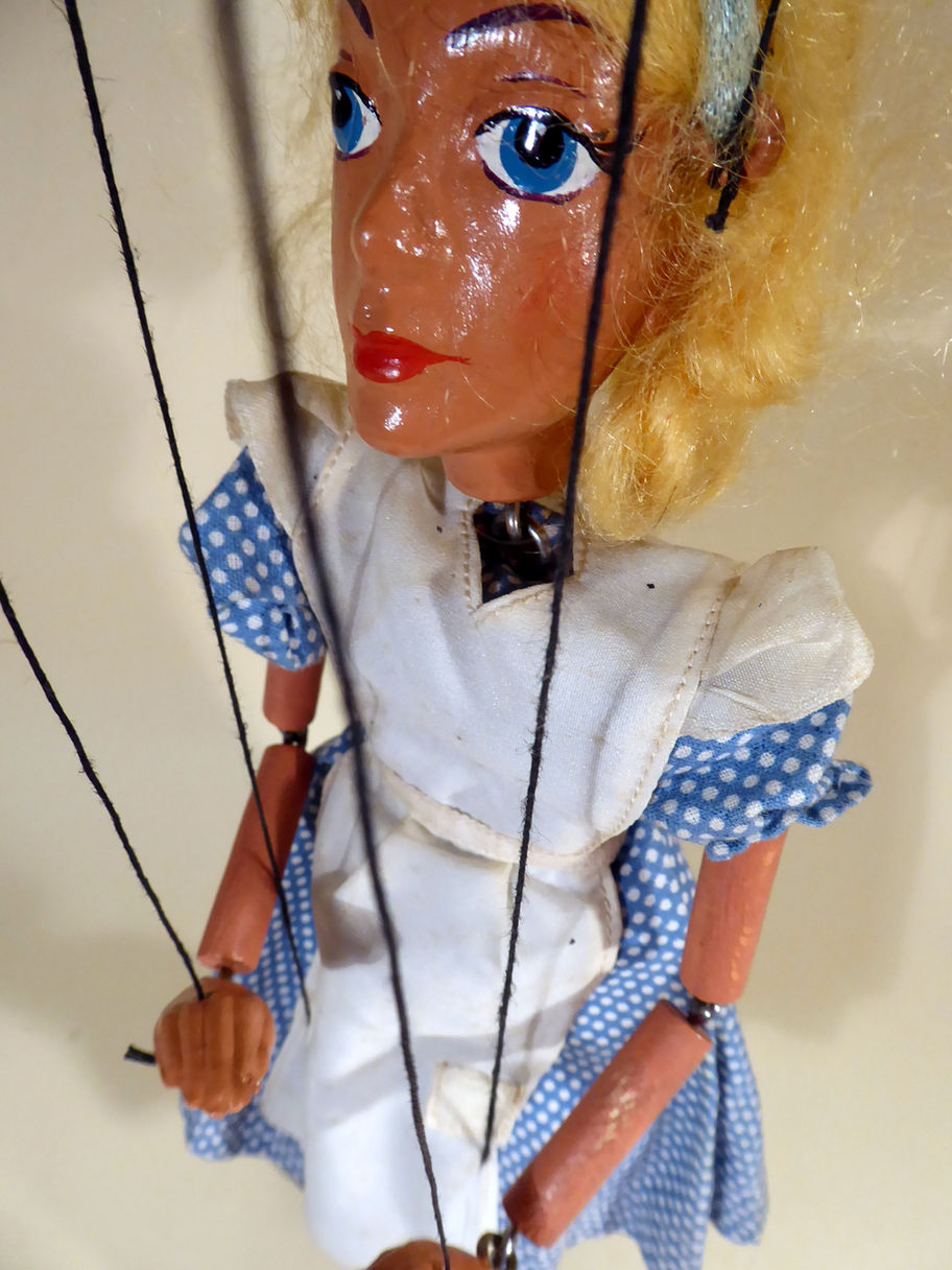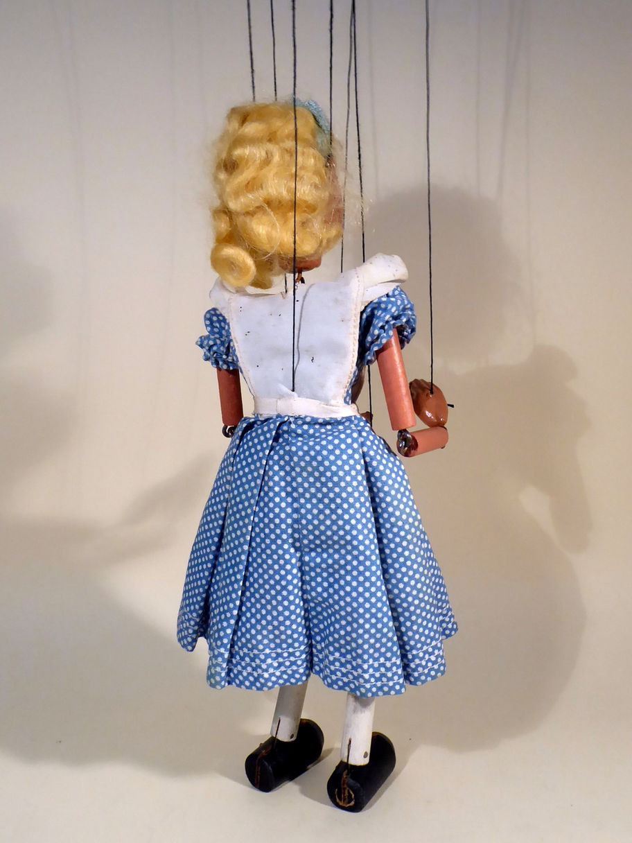 Type SL Alice from the Alice in Wonderland series of sought after puppets. Alice is the most commonly found of the series and can be found in several different coloured dresses. This is the classic blue with white apron. The blue dress has puffed sleeves and it is in good condition. The white apron has some ageing holes as seen. The face paint is very good. She wears her Alice band in her blond hair which is a little scruffy. Under her dress are white bloomers with a couple of wear holes at the back, not in the front, due to wear against the wooden lower body part. The original box is stamped correctly and is good with a set of instructions included.