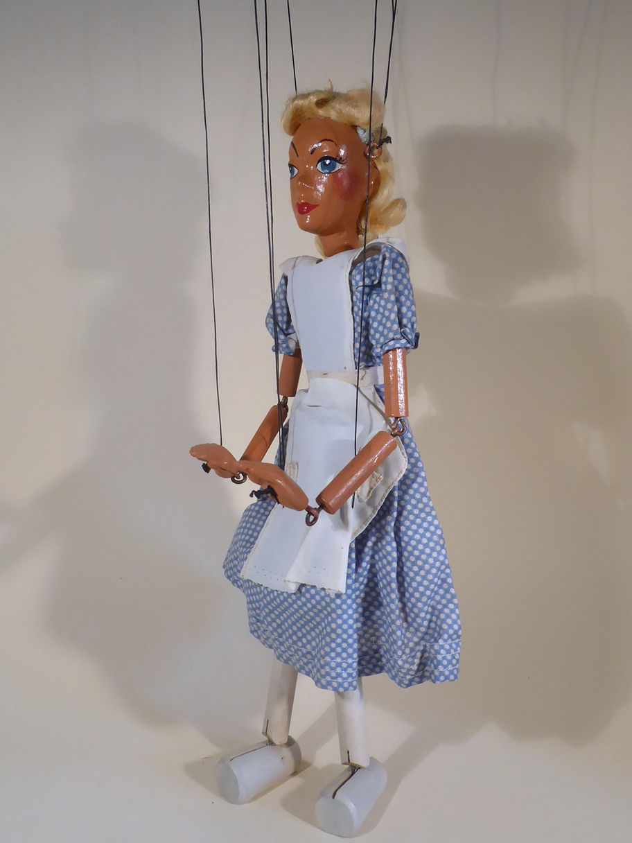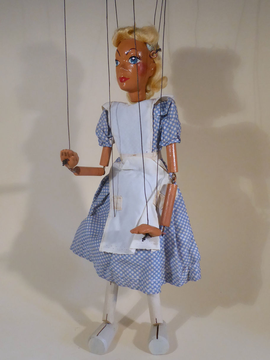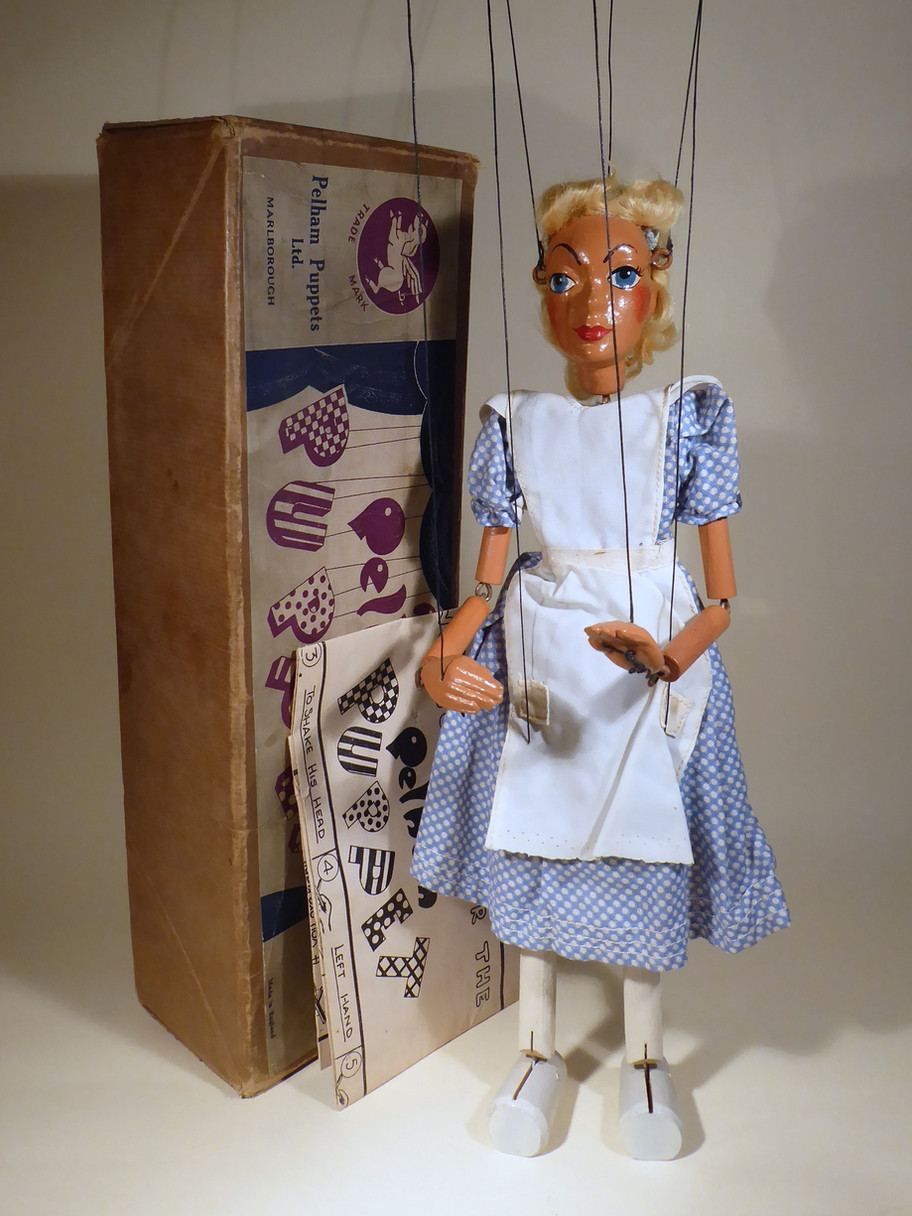 Type SL Alice 1950's sought after character from the Alice in Wonderland series, this the easiest to find. She has the solid heavy moulded head. The face paint is very pretty. She is in good all round condition with only minor ageing. The ribbon hairband is slightly damaged. The blond hair is quite thinned. The dress and apron are good with minor ageing. She wears white pantalons under the dress. She has painted white legs and feet, later versions have black painted shoes. Box stamped Alice in good used condition.