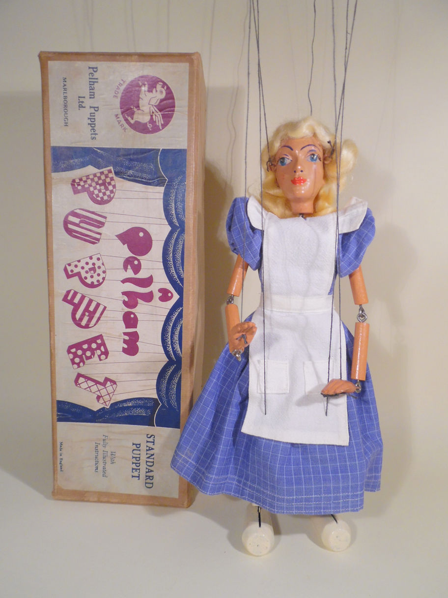 Type SL Alice, she is restored and re dressed. Alice looks to have been redressed by a professional restorer. I am unsure how much of this puppet is restored, the legs have certainly been repainted with white gloss paint and she does not wear the usual bloomers. Her dress is a copy of the original with the apron with pockets. The box is excellent and stamped one end.