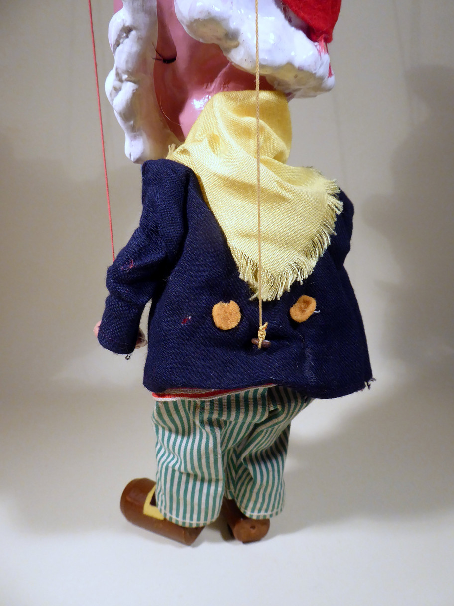 Type SL Big Ears, the character from the Enid Blyton children's books. He is in used condition with a dent/crack in the side of his face behind his beard. This wouldn't show on display. There is also a line on the other side which cant be felt but is a very light hairline if looked with a light. The puppet has suffered a little moth damage, the buttons on the jacket and the jacket itself has a small hole and signs of moth. Hat has a tiny hole and is just a little aged. Paintwork is good with good eye coverage. The felt buckles are good. The striped vest has what looks like a blue pen line on the front. With new felt buttons on his jacket I think he would look pretty good! Box is shelf worn, the name stamp has faded.