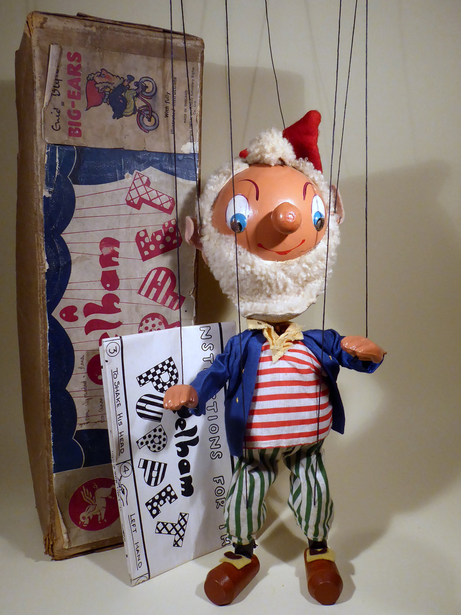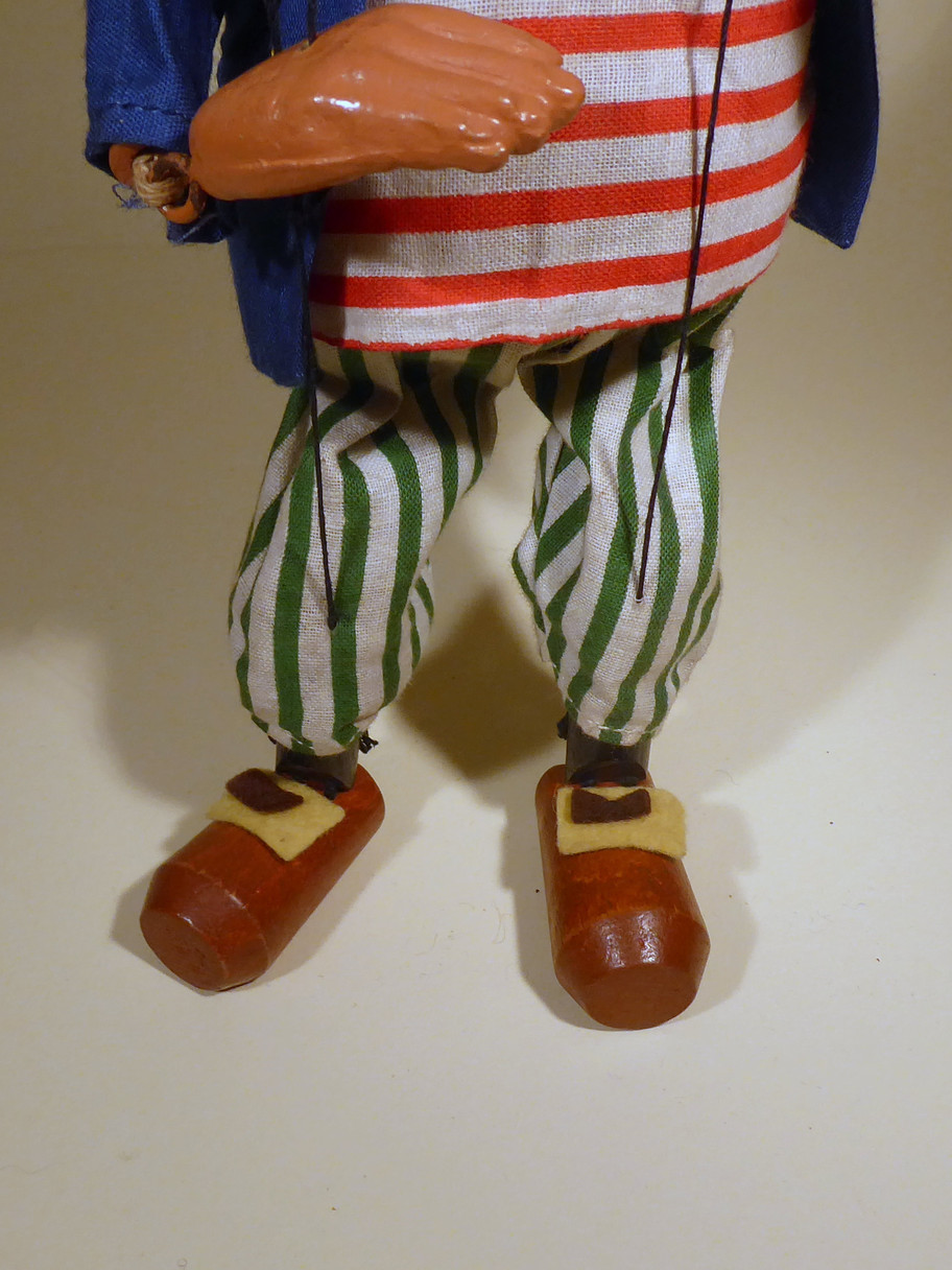 Type SL Big Ears with wooden ball head rather than sculpted composition head. This version is rarely found. Big Ears has a good wool beard. The two felt ears are a little moth damaged. The eyes have bad paint loss on them. Trousers and top are good, the yellow scarf has moth damage. The red hat is often hardened or moth damaged, this one is pretty good. He retains the felt buckles on his shoes. Box is aged but is the correct character type with label to the top. Instructions included.