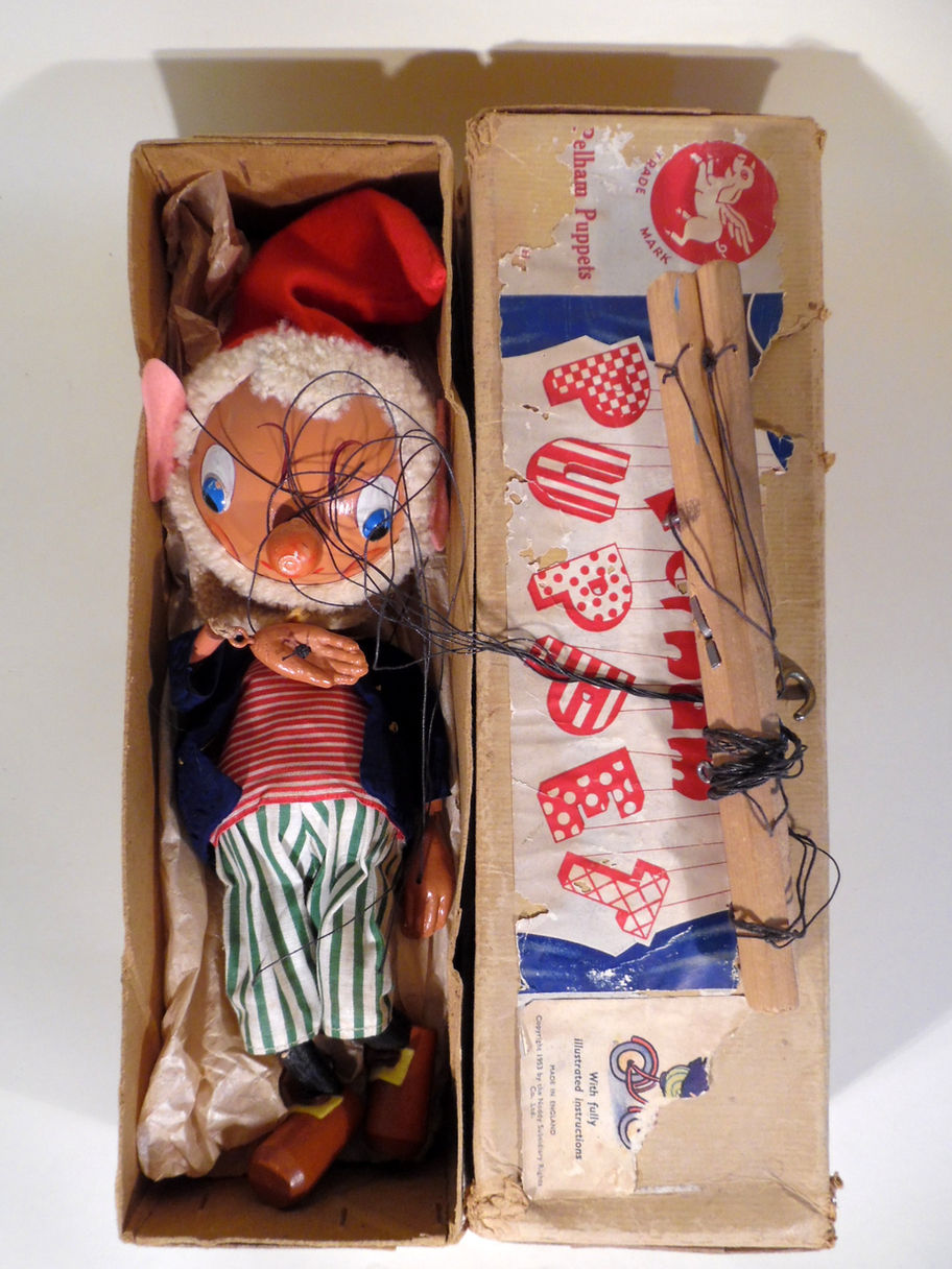 This is the early version of Big Ears, wooden ball head. He has a wonderful sheepskin beard and hair. This must be the best condition Big Ears puppet I have ever seen, he even has his felt ears intact! The felt hat is still very soft and has no damage. The whole costume is excellent. He retains felt bow on his shoes. The face paint is also very good with a single tiny paint fleck off one eye. Box is shelf worn with splits as seen but is original to the puppet.