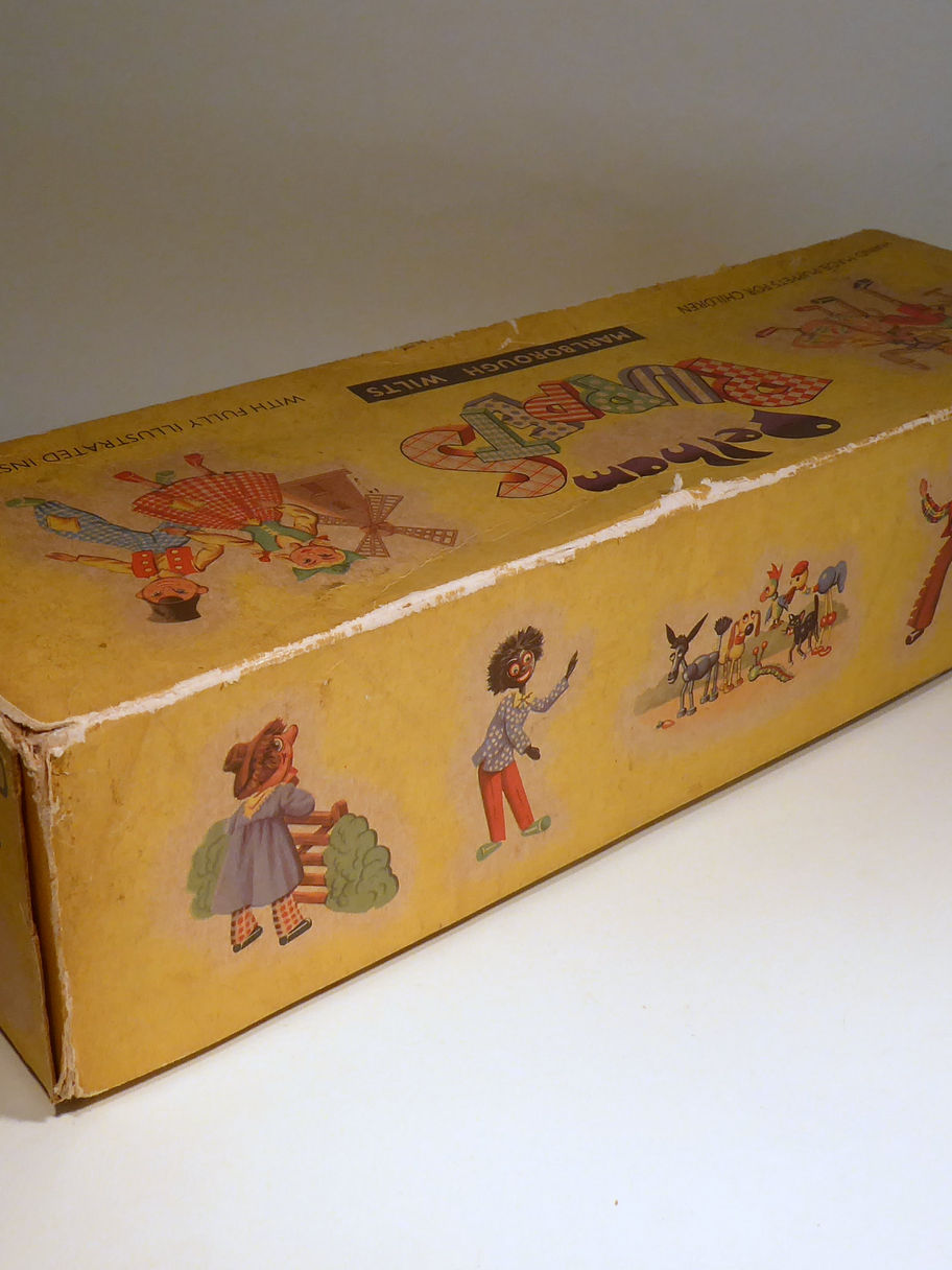 Type SL Bom, the little drummer boy character created by Enid Blyton in 1950's. Bom is in very good clean condition with no damage.Often the white trousers are dirty, these are clean and bright. This version is the first style with wooden legs rather than plastic. He has good face paint. Box is very aged and worn with the copyright Enid Blyton label on one end and no visible name stamp the other. Includes instructions.