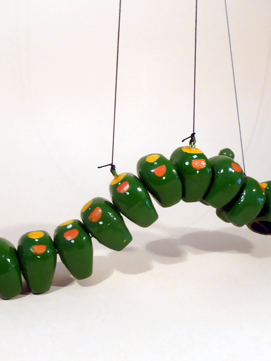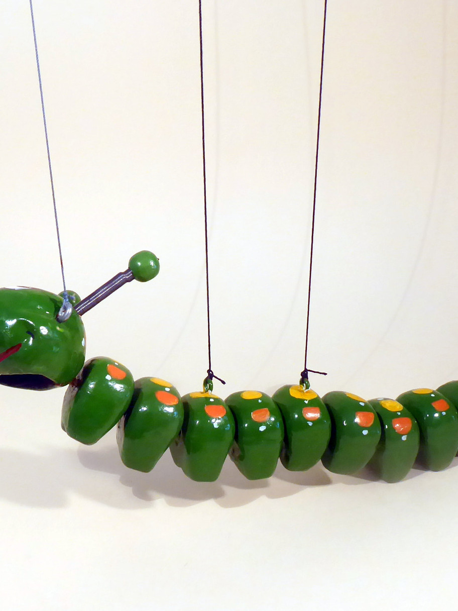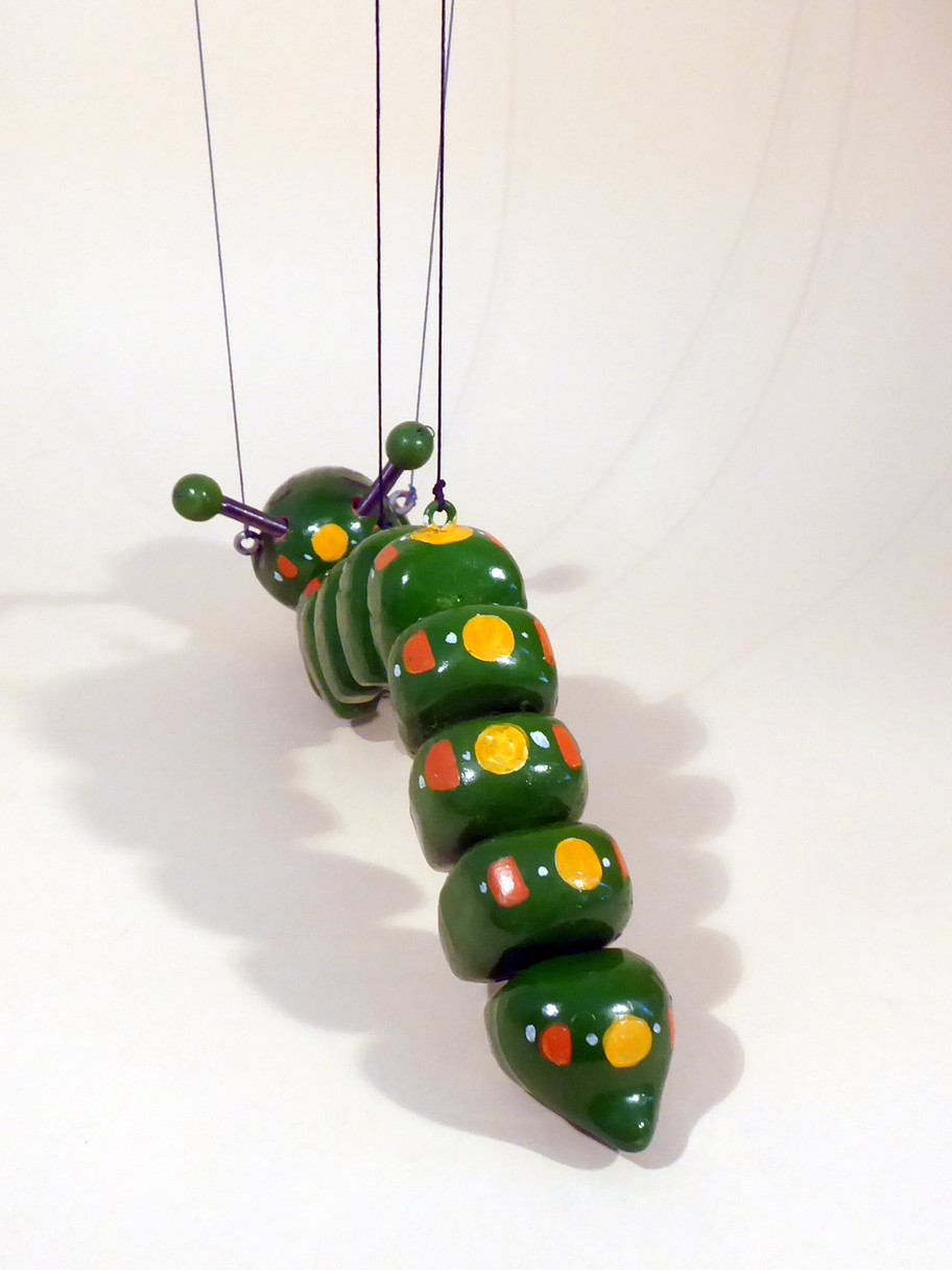 Caterpillar 1963 version with brightly painted segments. He is made from a composition material and is rarely seen. Excellent condition with good bright paint splodges. The antennae on springs are in good condition, often damaged. Box is very good, stamped Caterpillar one end. Scruffy instructions included with letter portion removed.