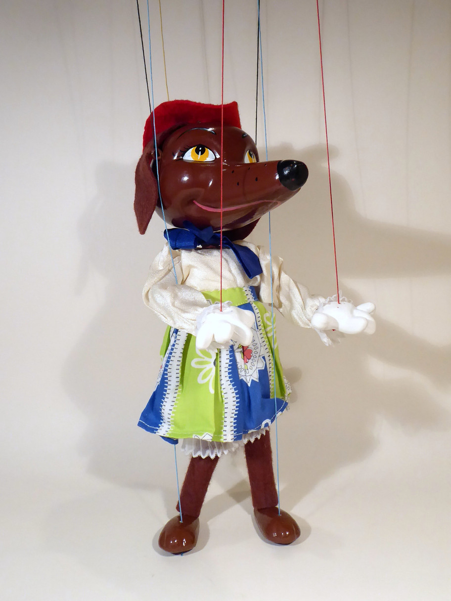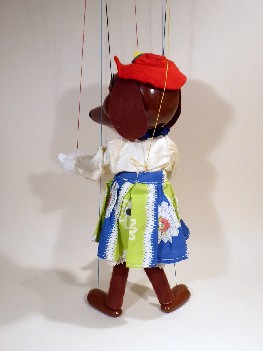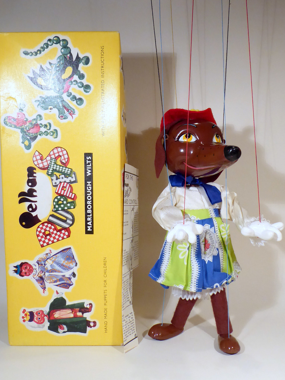 Type SL Dachshund, one of the rarer 1963 range puppets designed by Peter Carter-Page. She is in very good condition with crisp clean clothes. She wears skirt with white pantaloons under. This one has the blue ribbon scarf around her neck, others have yellow. The scarf is a little creased from storage. She wears a felt hat with flower decoration. The skirt has the 1963 label sewn on the inside seam. The box looks completely new and has no end stamp, it has a blank panel. Instructions with letter portion removed are included.