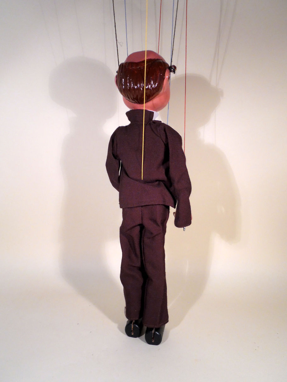Type SL Dr Beaker from the Supercar series by Gerry Anderson 1960's. He is a rare puppet and this one is in excellent condition with dark brown thick material suit. He has brown felt buttons all intact on the suit and a high collar that sticks up against his neck with a small black tie. He has a dark skin tone. The collar is attached to the neck, I have seen this on other Dr Beaker puppets. There is a small blemish/defect at the back of his neck but this is not a crack. These puppets can crack easily around the neck though in temperature changes and in transit so should always be packed well. A set of instructions pre decimal with Pelpop letter still attached and the box with the correct sticker one end and name stamp the other.
