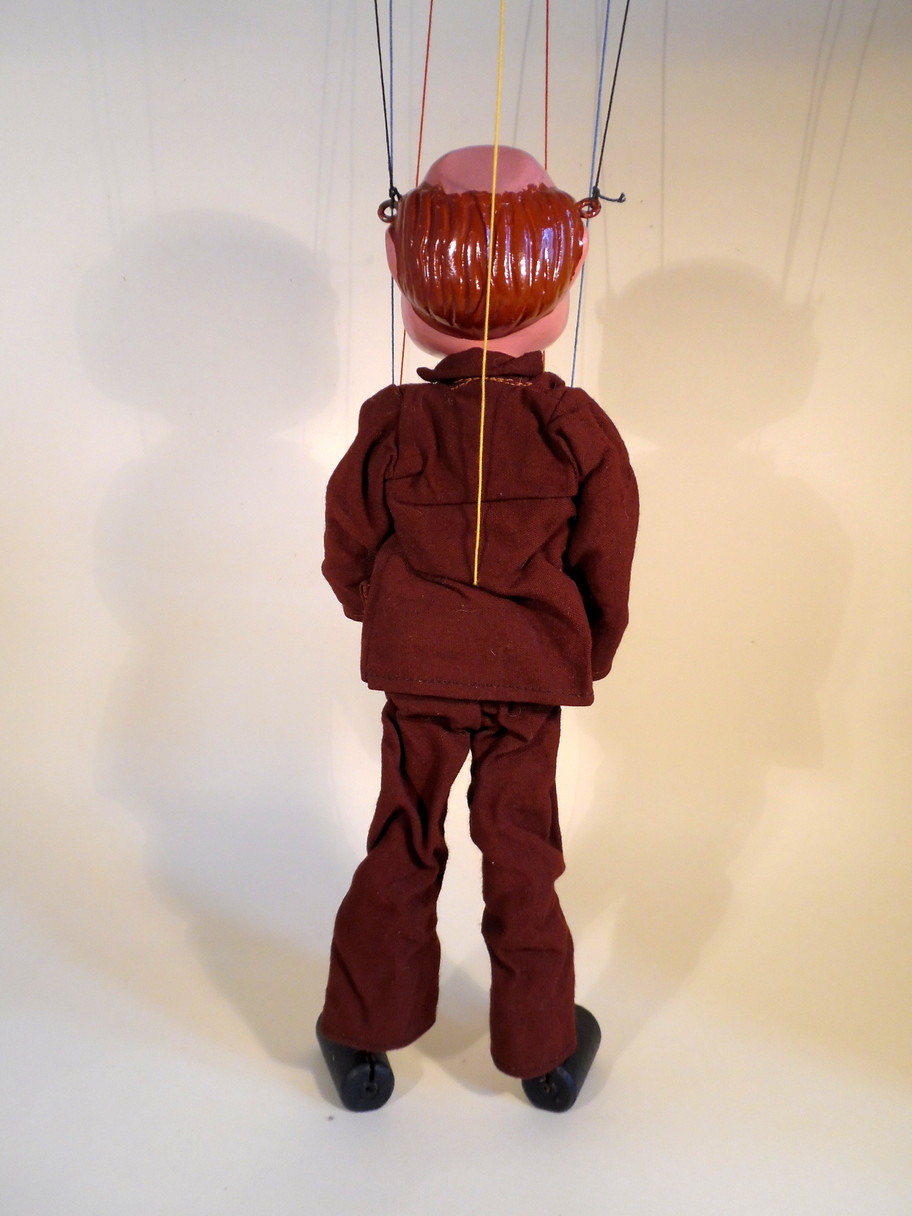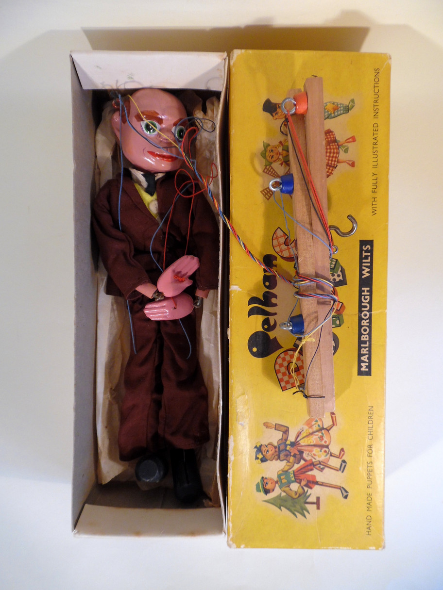 Type SL Dr Beaker from the Supercar series by Gerry Anderson 1960's. He is a rare puppet and this one is in excellent condition with dark brown thick material suit. He has felt buttons all intact on the suit and the waistcoat underneath. A set of instructions pre decimal with pelpop letter still attached and the box with no visible name stamp one end and remnants of a sticker the other end.