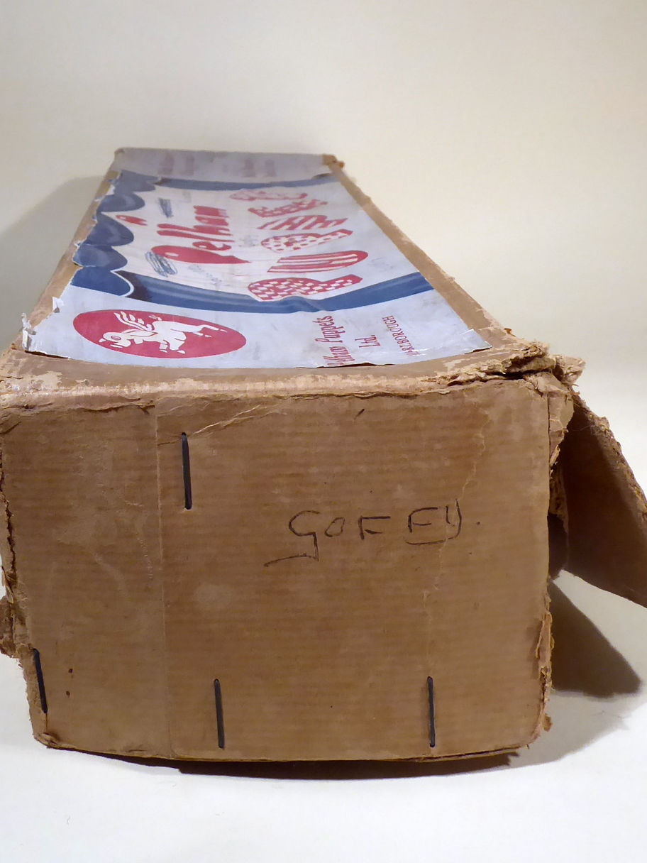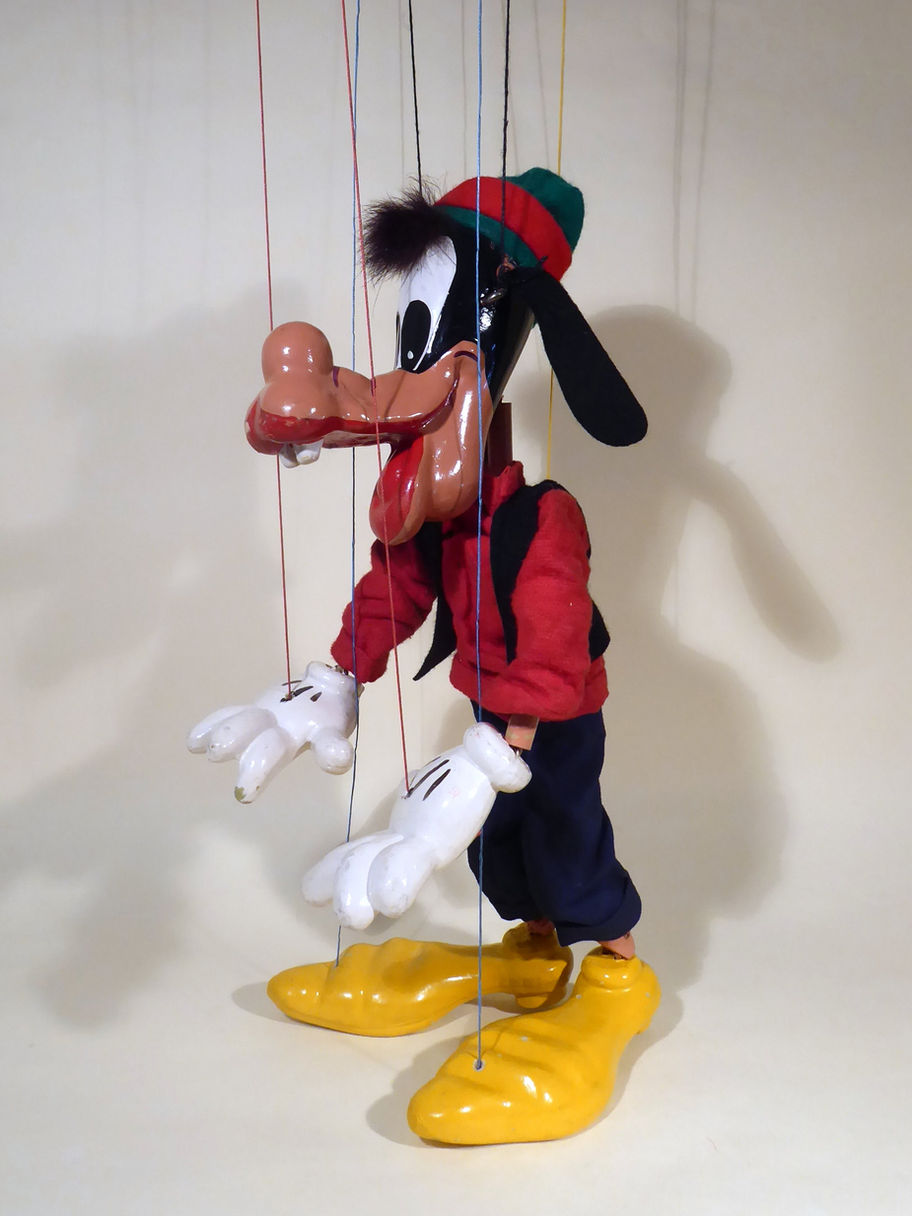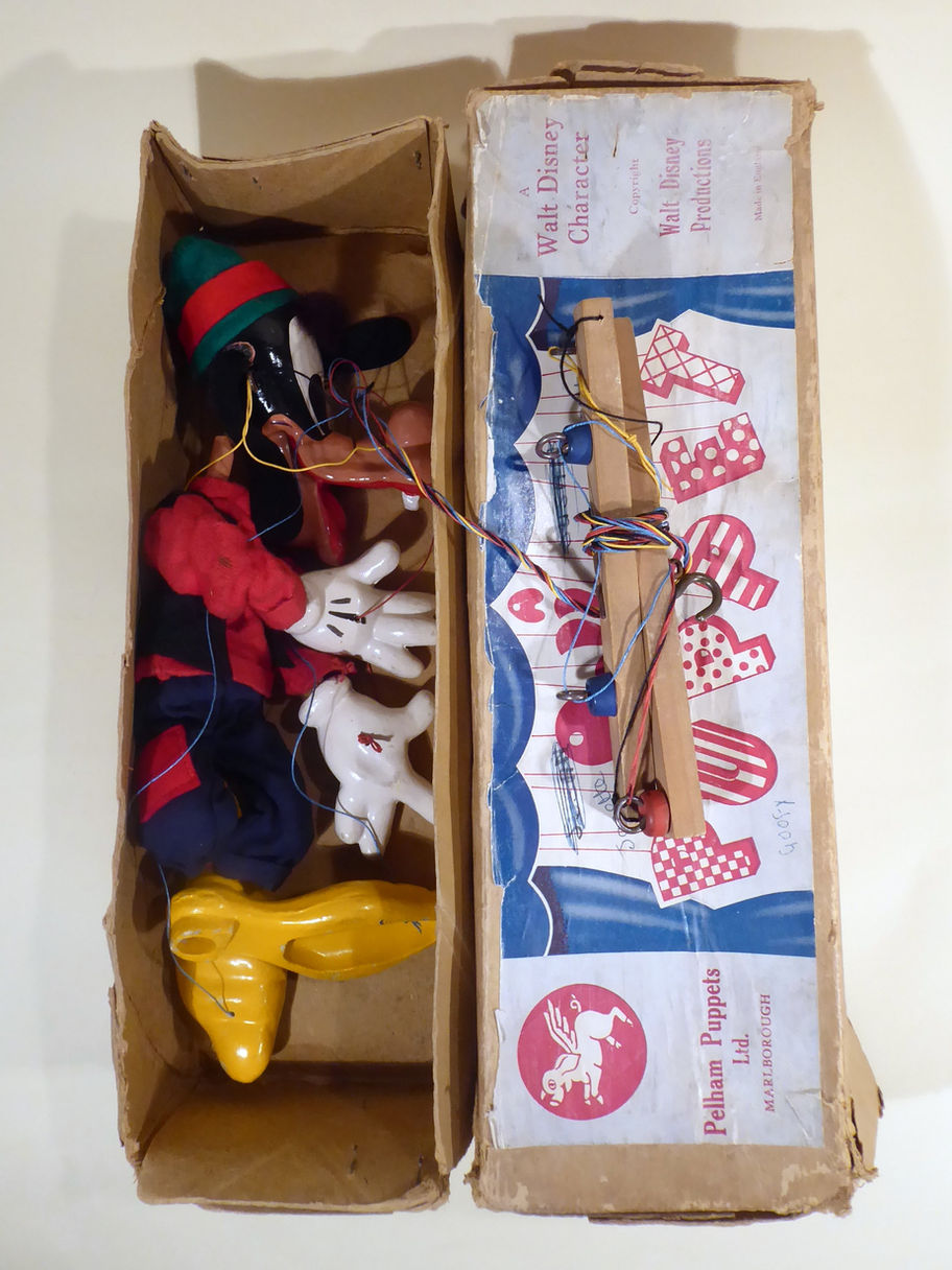 Type SL Goofy the 1950's version which is rarely seen. He has large composition hands with three black stripes on the back. There is a chip/scuff to the finger on the right hand and a little on left finger. The legs are wooden and he has bamboo arms. The feet and hands are heavy. This puppet is in well used condition. He retains thick felt ears, he has a real fur tuft of hair. The trousers are creased from storage but have no holes. The red sweater is aged and has some rust marks, the waistcoat seems good. The hat also has no moth damage. There are no cracks and no damage to his head. He has a scuff in the paintwork to his mouth. He doesn't have a black bead nose but there is no evidence at all that he ever did have one, so I am not sure about it, but I have to assume he never had a nose attached. The original owner has said he was always like this. The blue leg string is a replacement. The original box is very poor with splits and ageing.