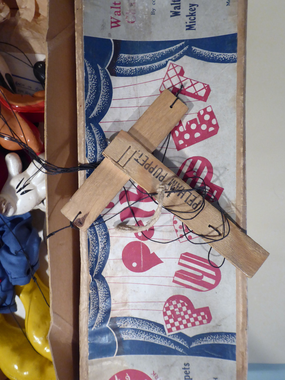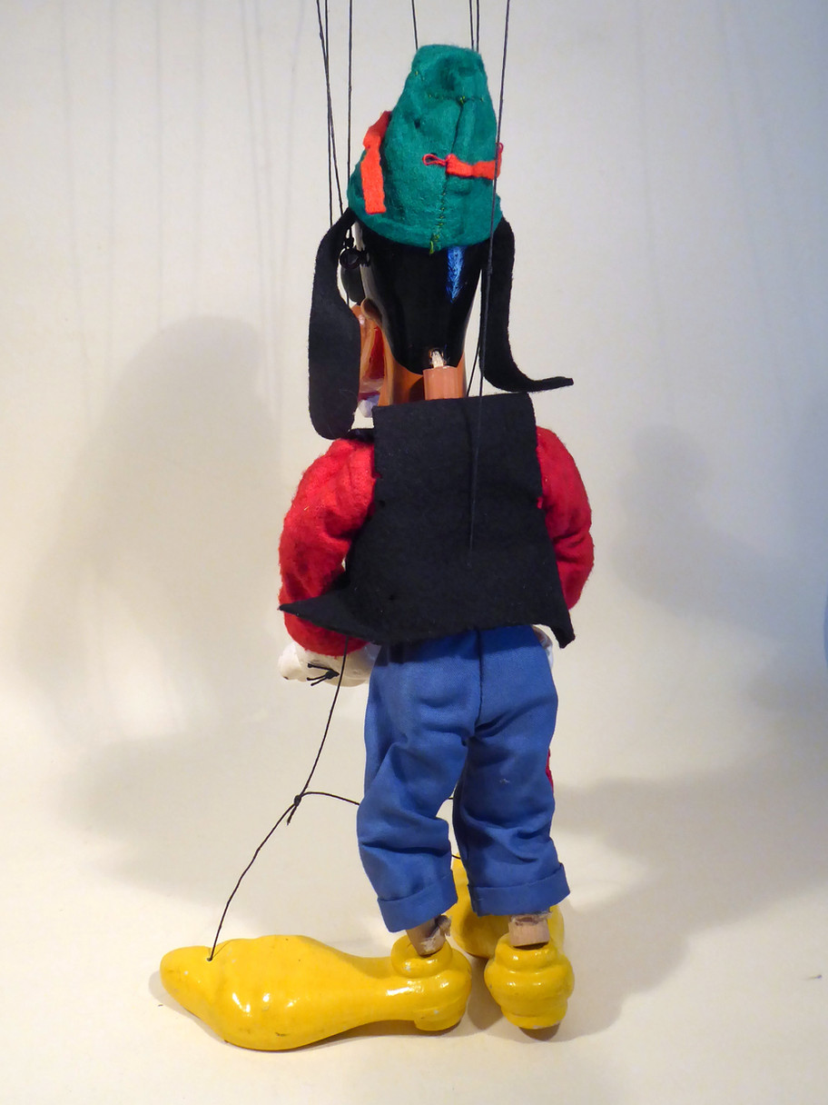 Type SL Goofy the 1950's version which is rarely seen. He has large composition hands with three black stripes on the back. The legs are wooden and he has bamboo arms. The feet and hands are heavy and these early Disney puppets are often strung on short strings, these are not too short. The clothes are aged, the felt waistcoat has moth damage and also the felt hat with red band damaged. The red top is aged and the trousers are good but with a tiny moth hole. There are no cracks and no damage to his head. The large shoes are good. The strings on this type of puppet always have an extra string from the foot to his knee, this one still has this method of stringing. The original box is aged with correct name stamp one end.