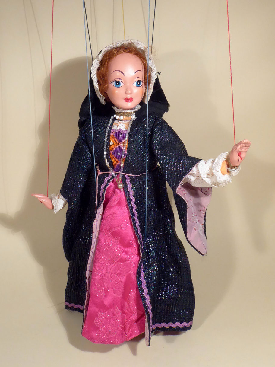 Type SL Historical "Special" Lady She has auburn hair a lovely face. She is in very good condition with no damage. She has composition hands and plastic legs with silver ballet shoes. The Pelham label is on the seam of her gown. She wears a black velvet headdress. In the images you might see a small line on the left side of her neck, this is not a crack/hairline and is not apparent to touch. The box is very poor as seen, but will be sent with the puppet.