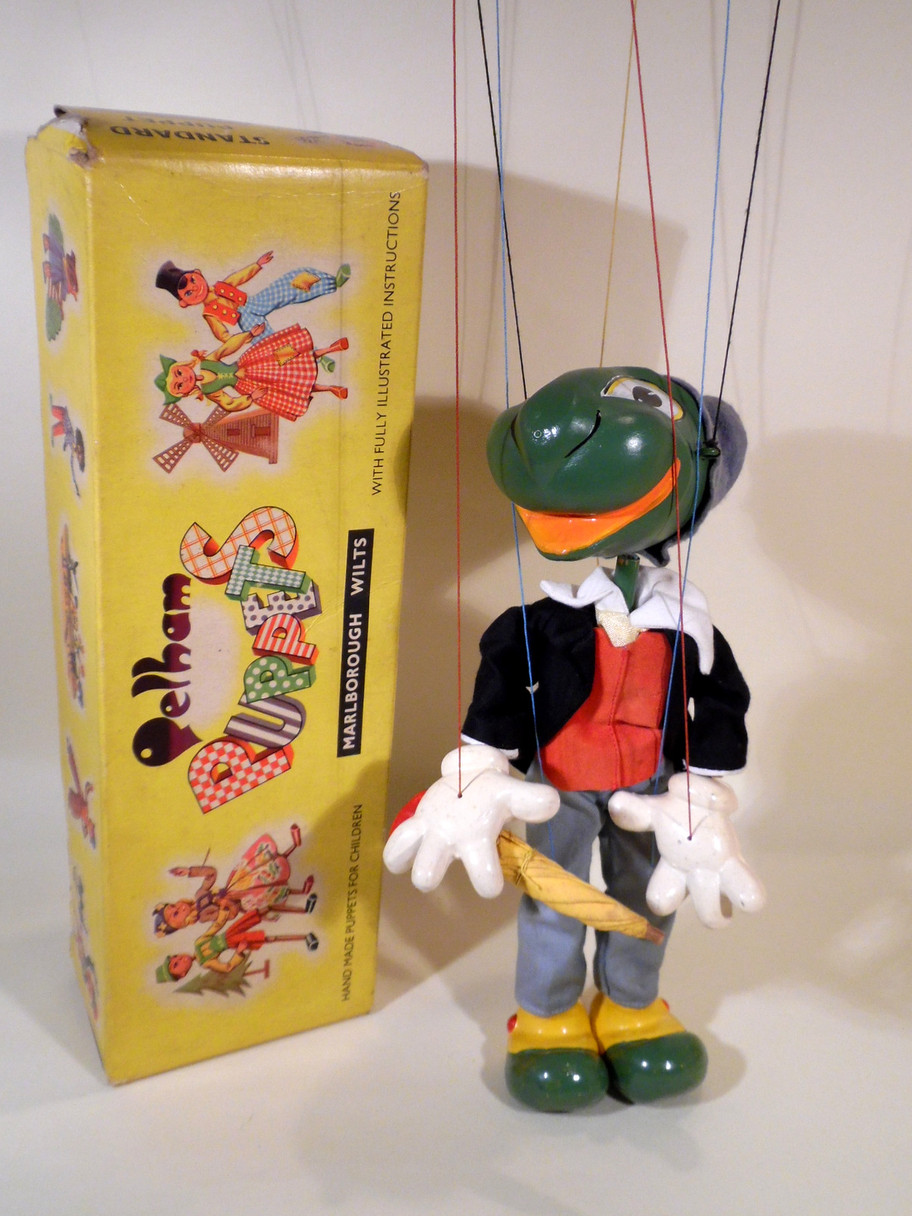 Type SL Jiminy Cricket 1960's. The Walt Disney character which is seen less often than Pinocchio his partner in adventure. He is in good condition and still has his umbrella which is often missing. The canvas material umbrella is a little grubby as seen. The clothes are clean and undamaged. He has a little yellow tie with shirt and suedette waistcoat which is usually hardened with age which this one is. The felt hat is good. Box stamped one end and sticker the other has a split as seen but is good otherwise.