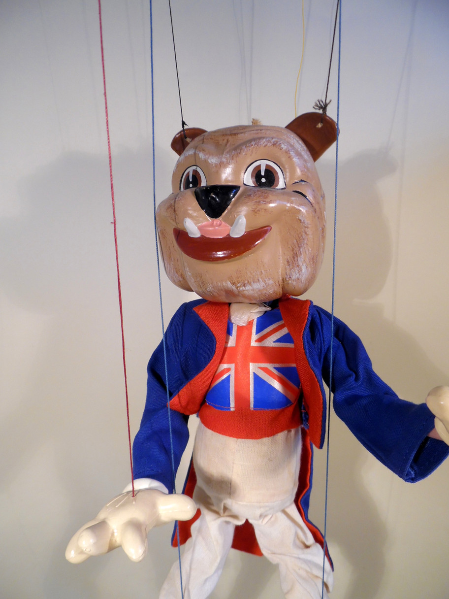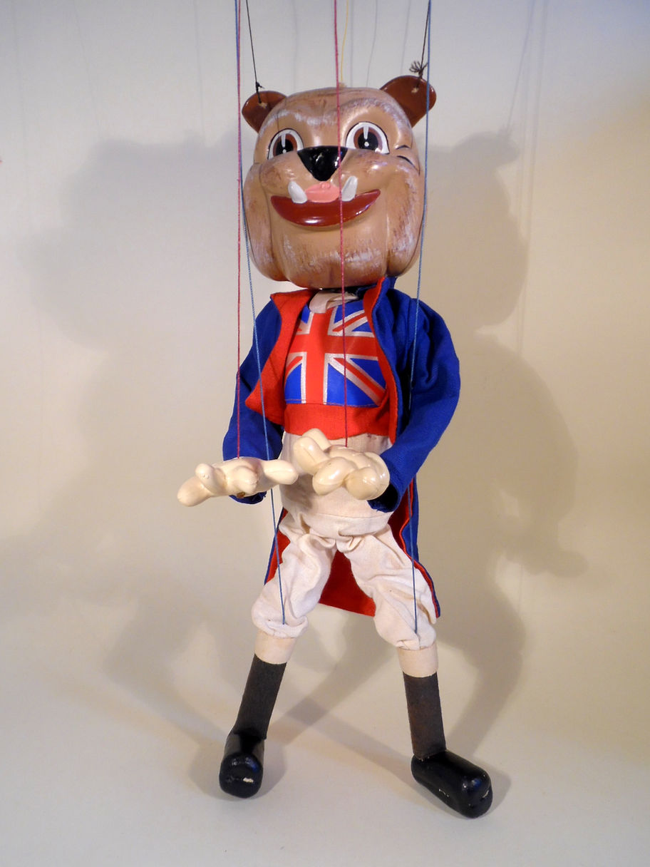Type SL John Bulldog. He is a rare puppet but has some ageing to his costume, the white trousers are yellowed at the waist. The plastic hands are yellowed. The strings have been replaced. The similar puppet John Bull with a different head is for sale on this site. Tthe box which is correct for era is damaged and very poor, but will accompany the puppet.