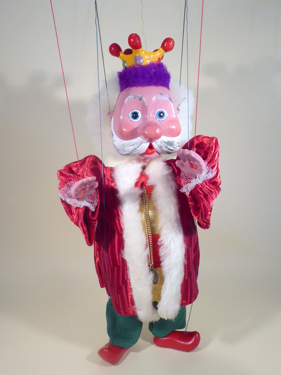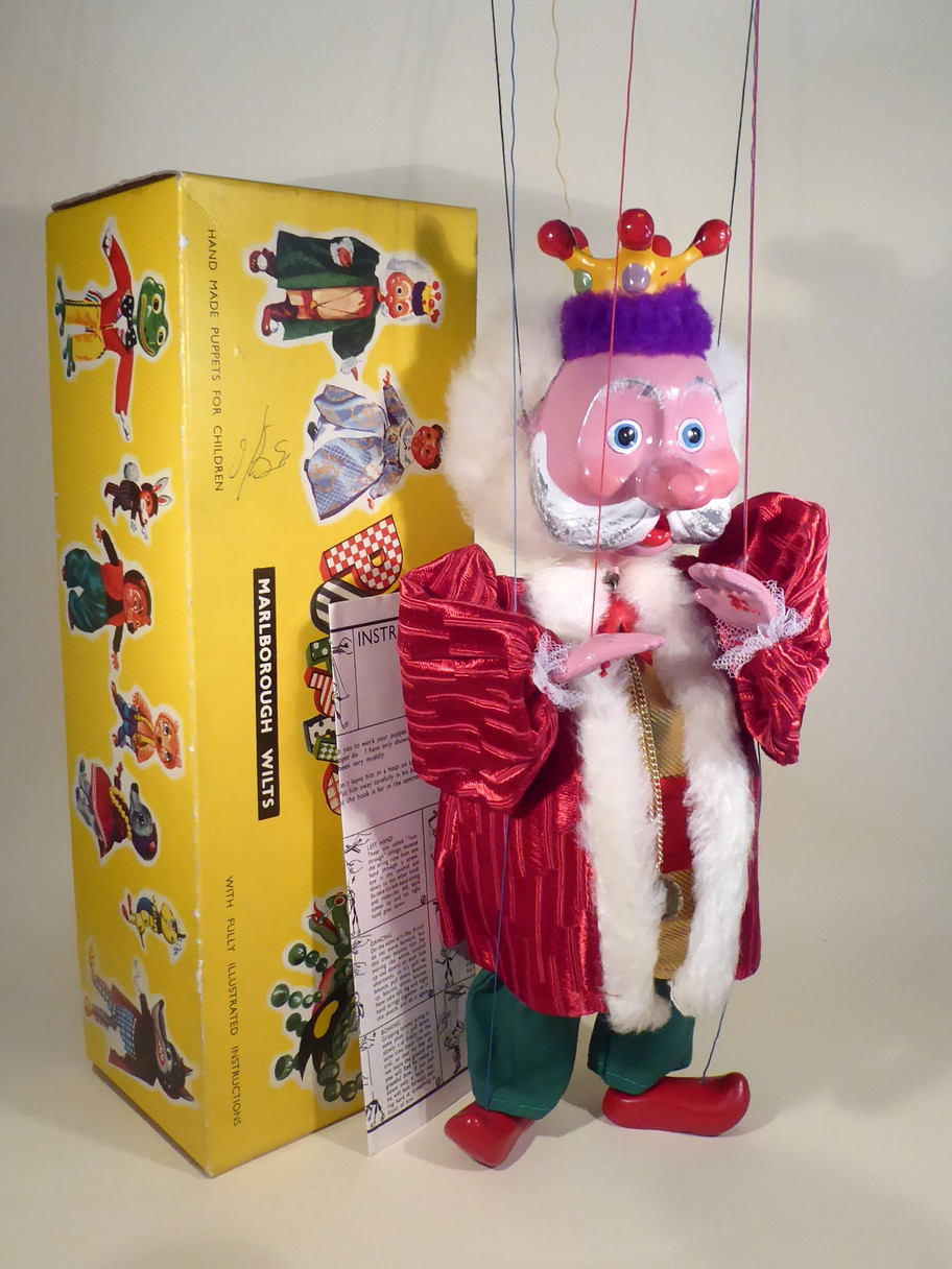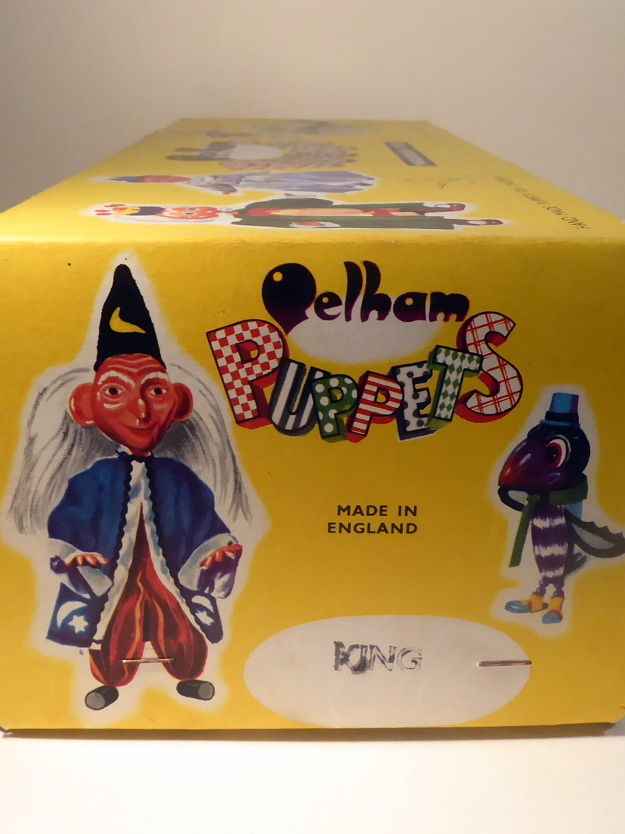 Type SL King with moulded crown. He is the first version of the SL type King, later editions had a felt crown. The puppet is in excellent condition. Often the prongs of the yellow moulded crown have snapped and have been reglued and restored. This one is perfect with no restoration or damage. The King wears a very ornately decorated gown with massive sleeves. He wears a gold vest with yellow back and red felt belt. He has amazing full fur hair. He has his long chain with medallion around his neck. He has the 1963 label at the bottom of his cloak. The box is very good with the name stamp one end. Instructions included.